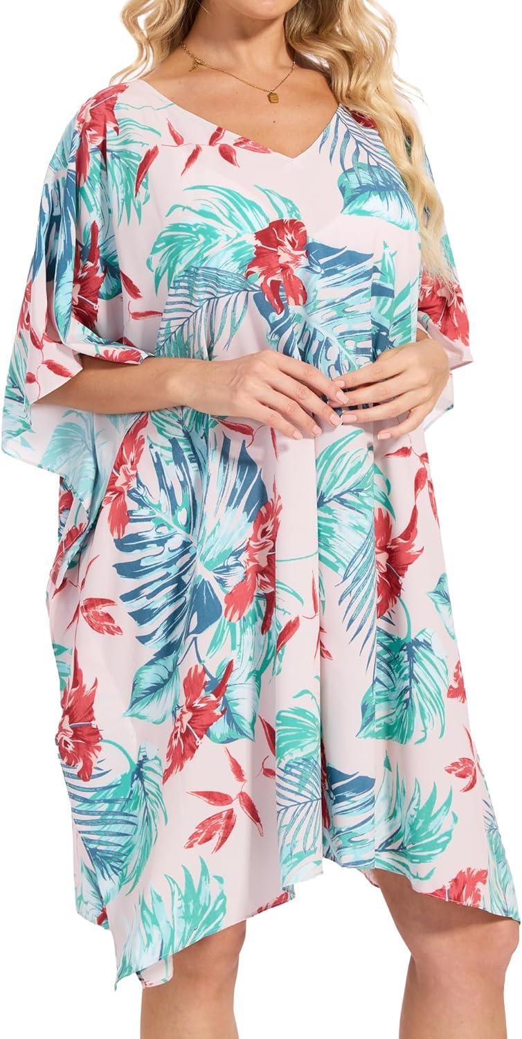 Moss Rose Beach Kaftan Dresses for Women V Neck Summer Swimsuit Cover up Beach Vacation Clothing(A-red)