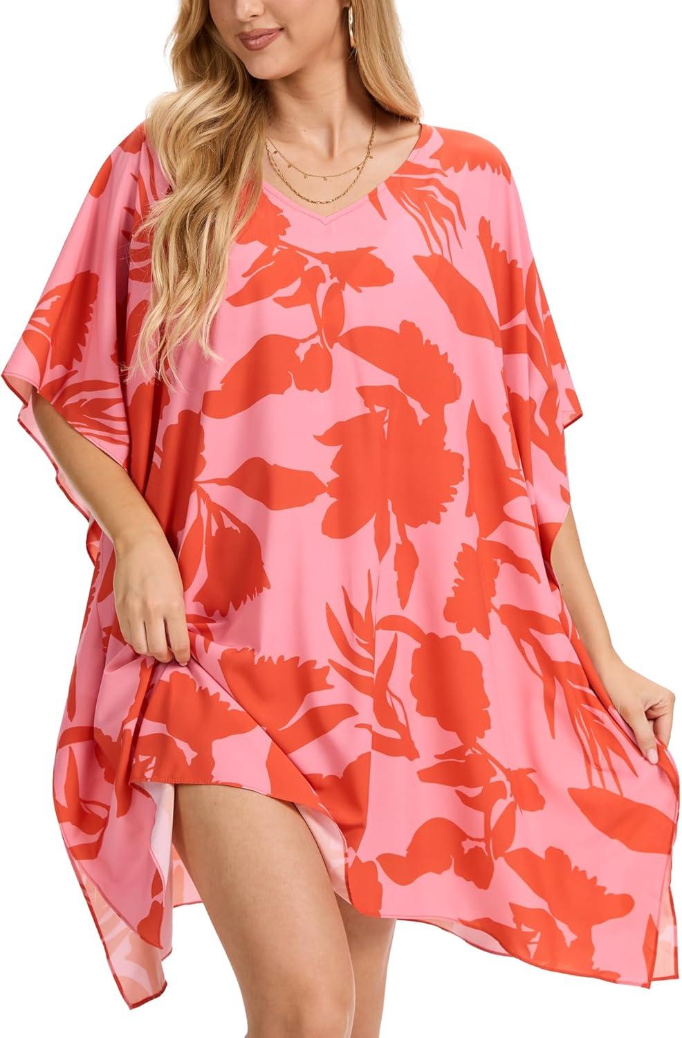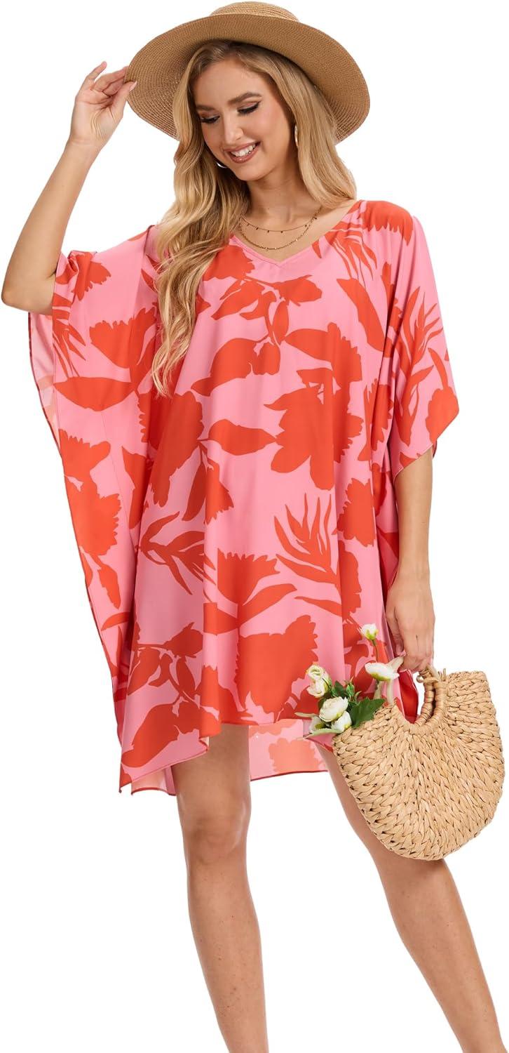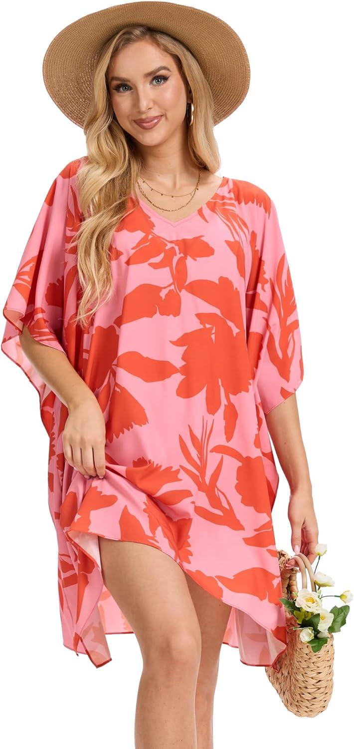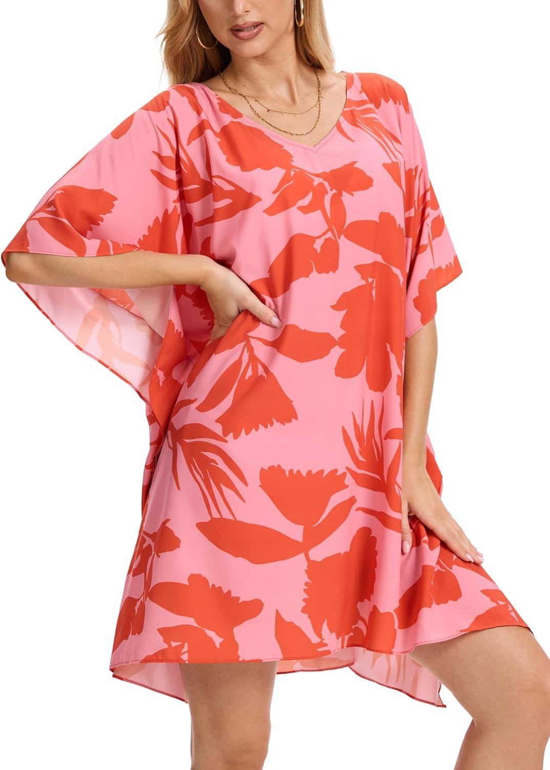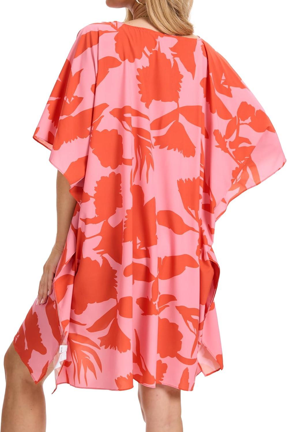Moss Rose Beach Kaftan Dresses for Women V Neck Summer Swimsuit Cover up Beach Vacation Clothing(A-red)