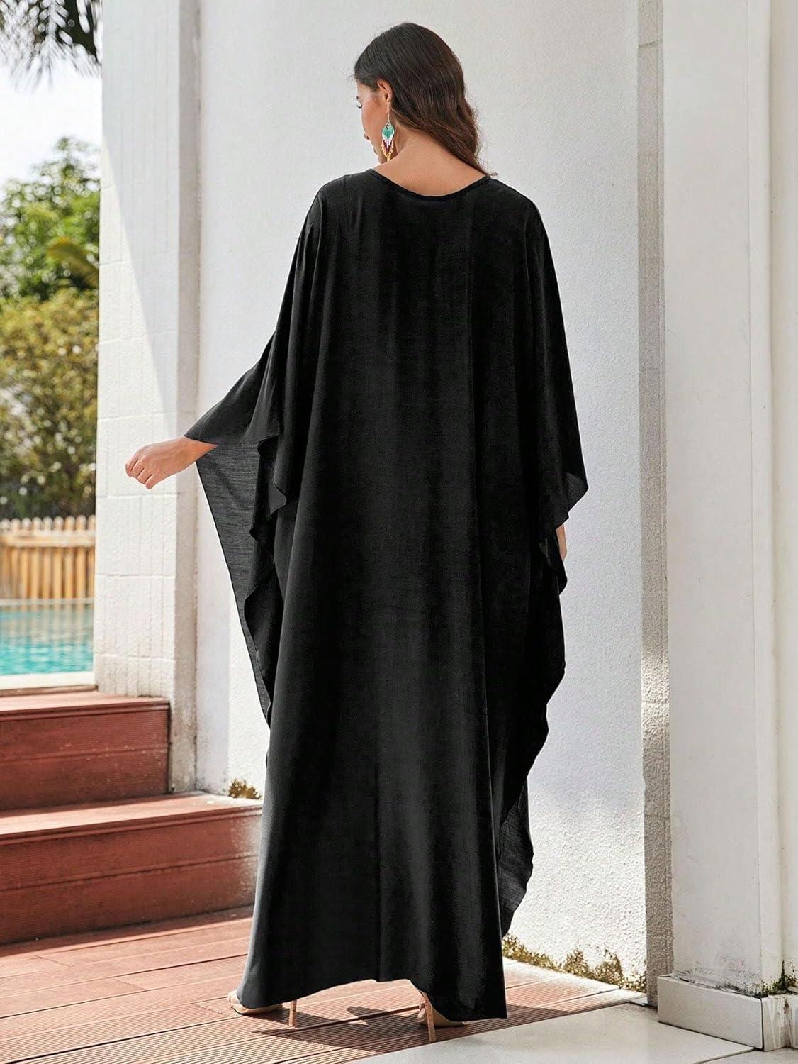 Moss Rose Caftan Coverup Dresses for Women V Neck Summer Swimsuit Kaftan Plus Size Maxi Beach Vacation Clothes(A-black)