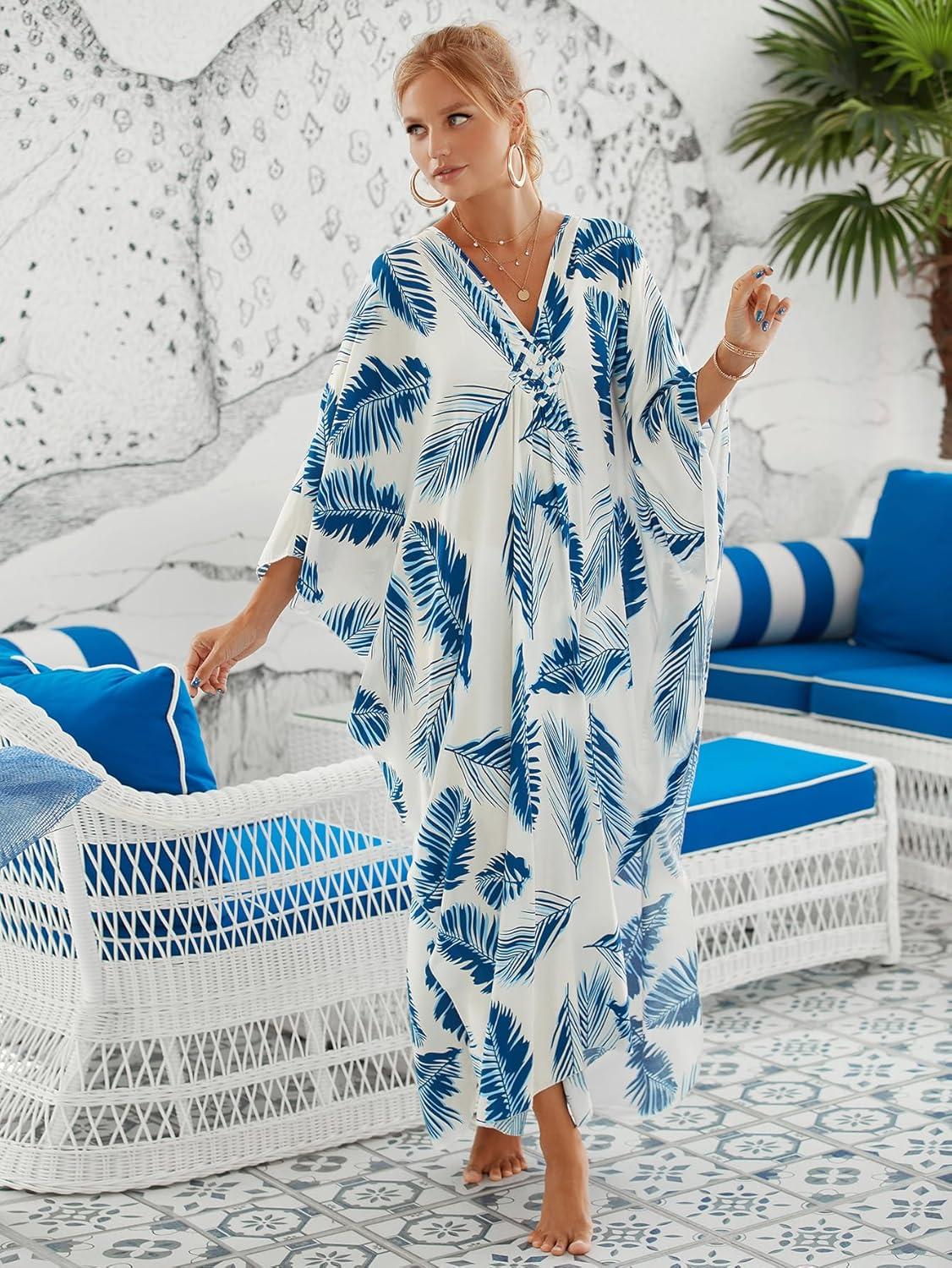Moss Rose Caftan Coverup Dresses for Women V Neck Summer Swimsuit Kaftan Plus Size Maxi Beach Vacation Clothes(A-blue)