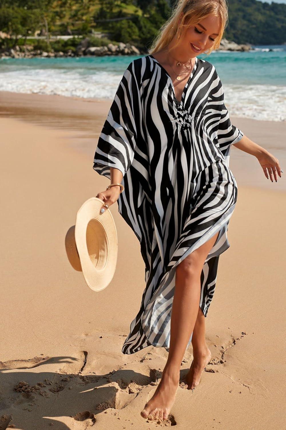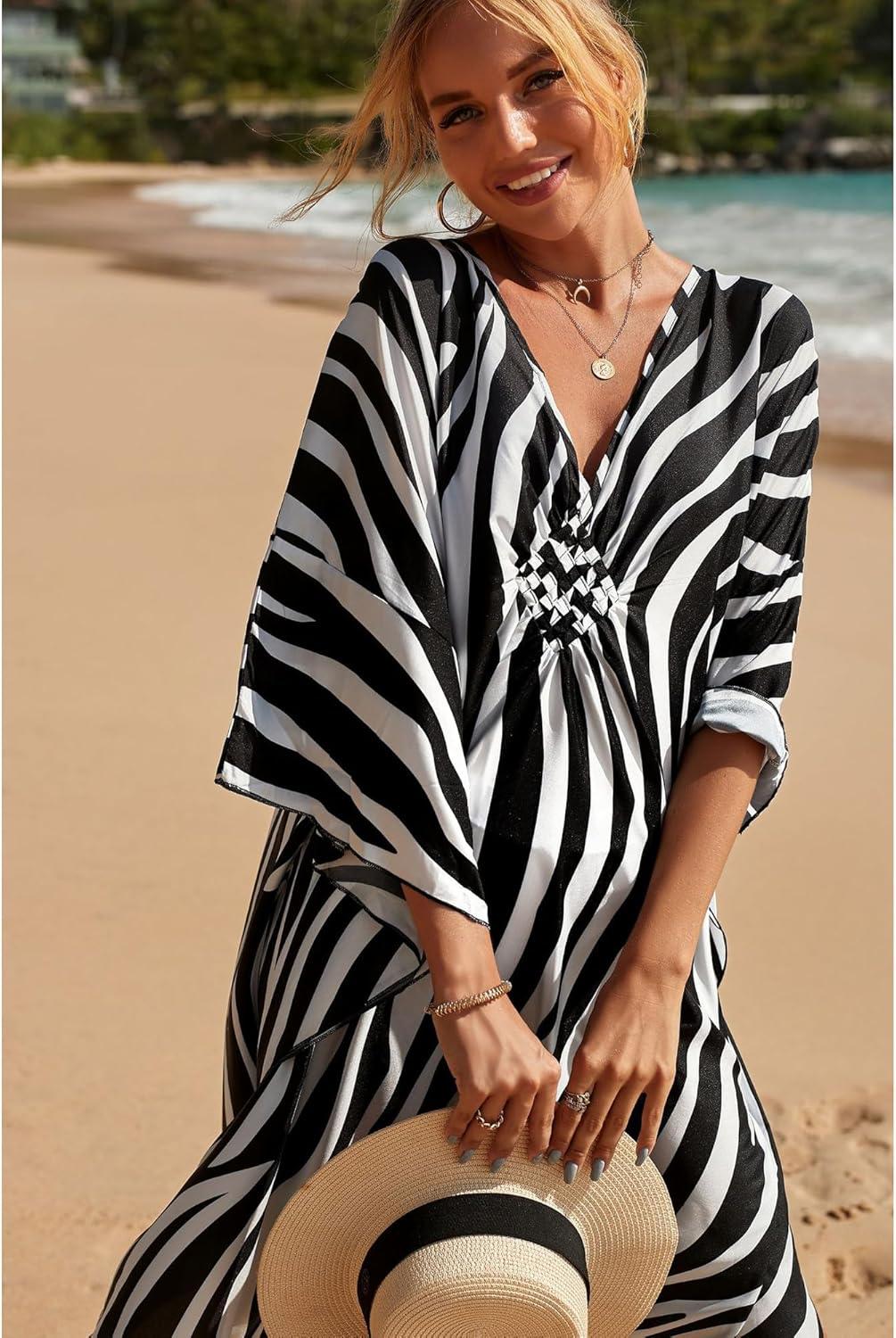 Moss Rose Caftan Coverup Dresses for Women V Neck Summer Swimsuit Kaftan Plus Size Maxi Beach Vacation Clothes(A Stripe)