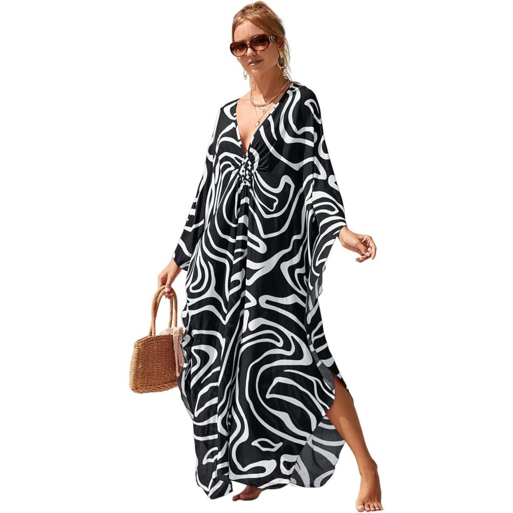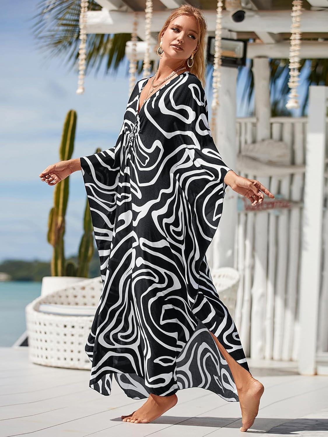 Moss Rose Caftan Coverup Dresses for Women V Neck Summer Swimsuit Kaftan Plus Size Maxi Beach Vacation Clothes(B-black Zebra)