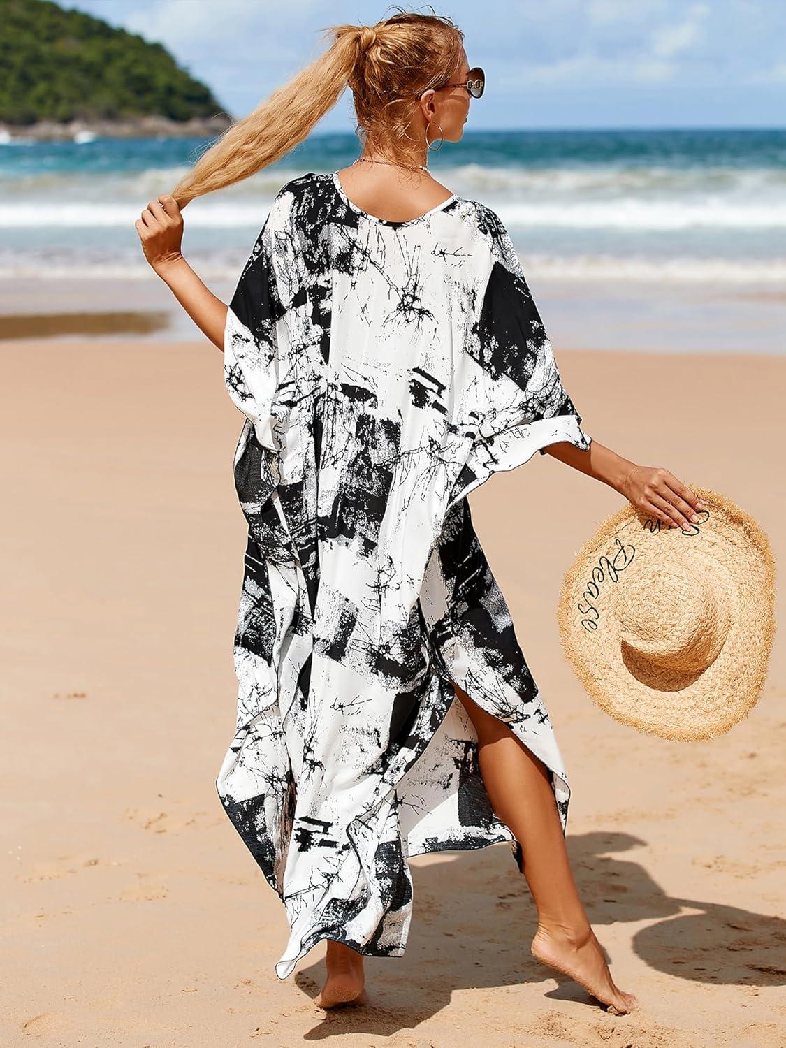 Moss Rose Caftan Coverup Dresses for Women V Neck Summer Swimsuit Kaftan Plus Size Maxi Beach Vacation Clothes(B-black Zebra)