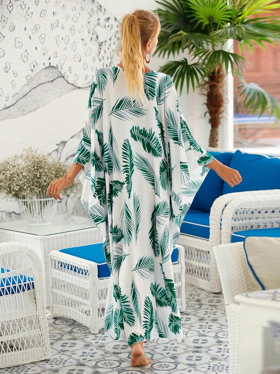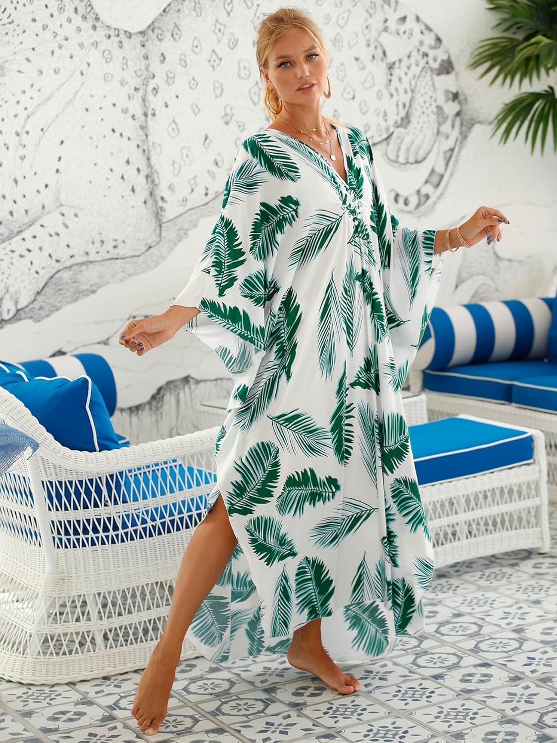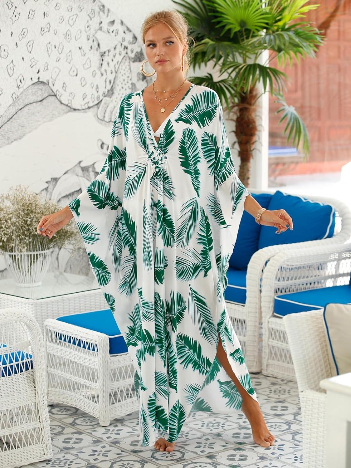 Moss Rose Caftan Coverup Dresses for Women V Neck Summer Swimsuit Kaftan Plus Size Maxi Beach Vacation Clothes(B-green Leaf)