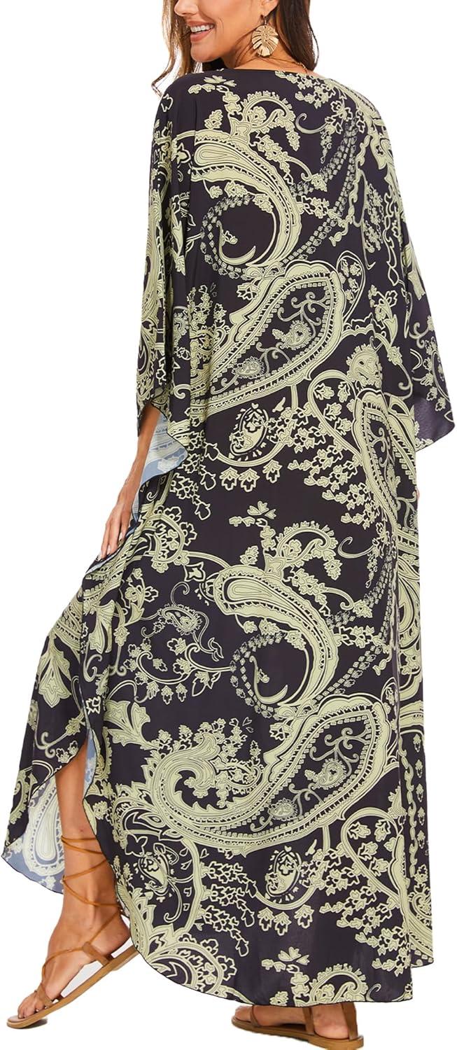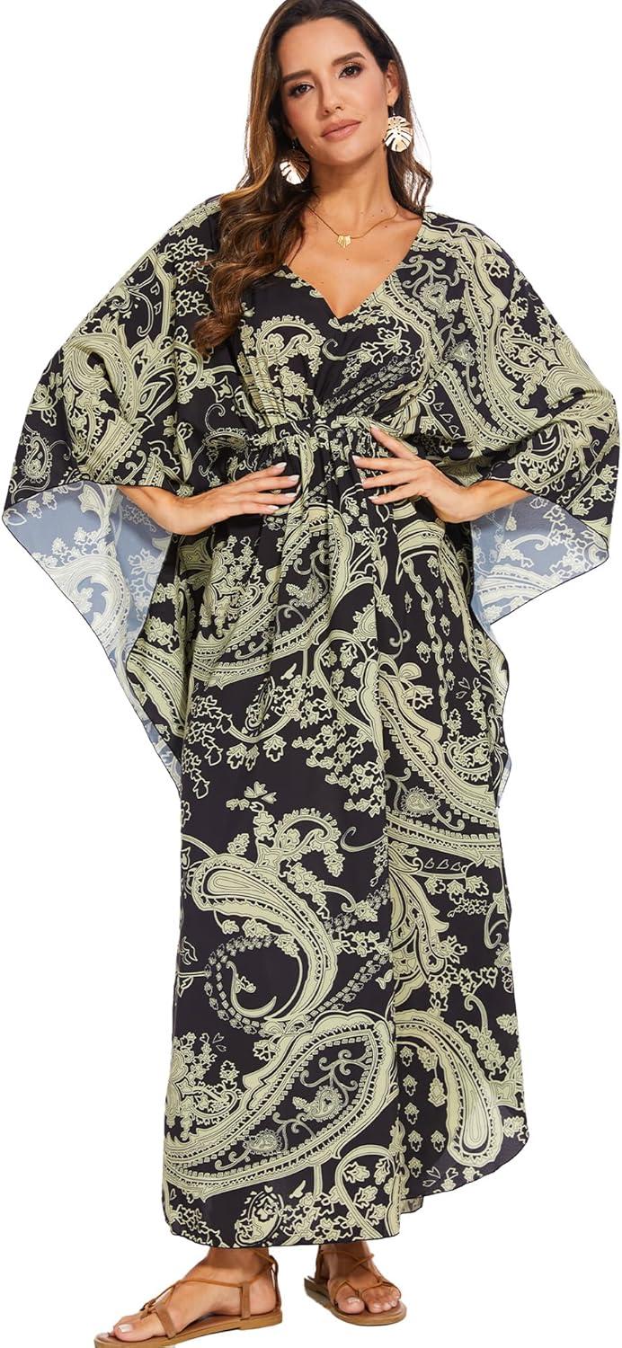 Moss Rose Kaftan Dresses for Women V Neck Summer Swimsuit Cover up Caftan Maxi Beach Dresses(A-black Green)