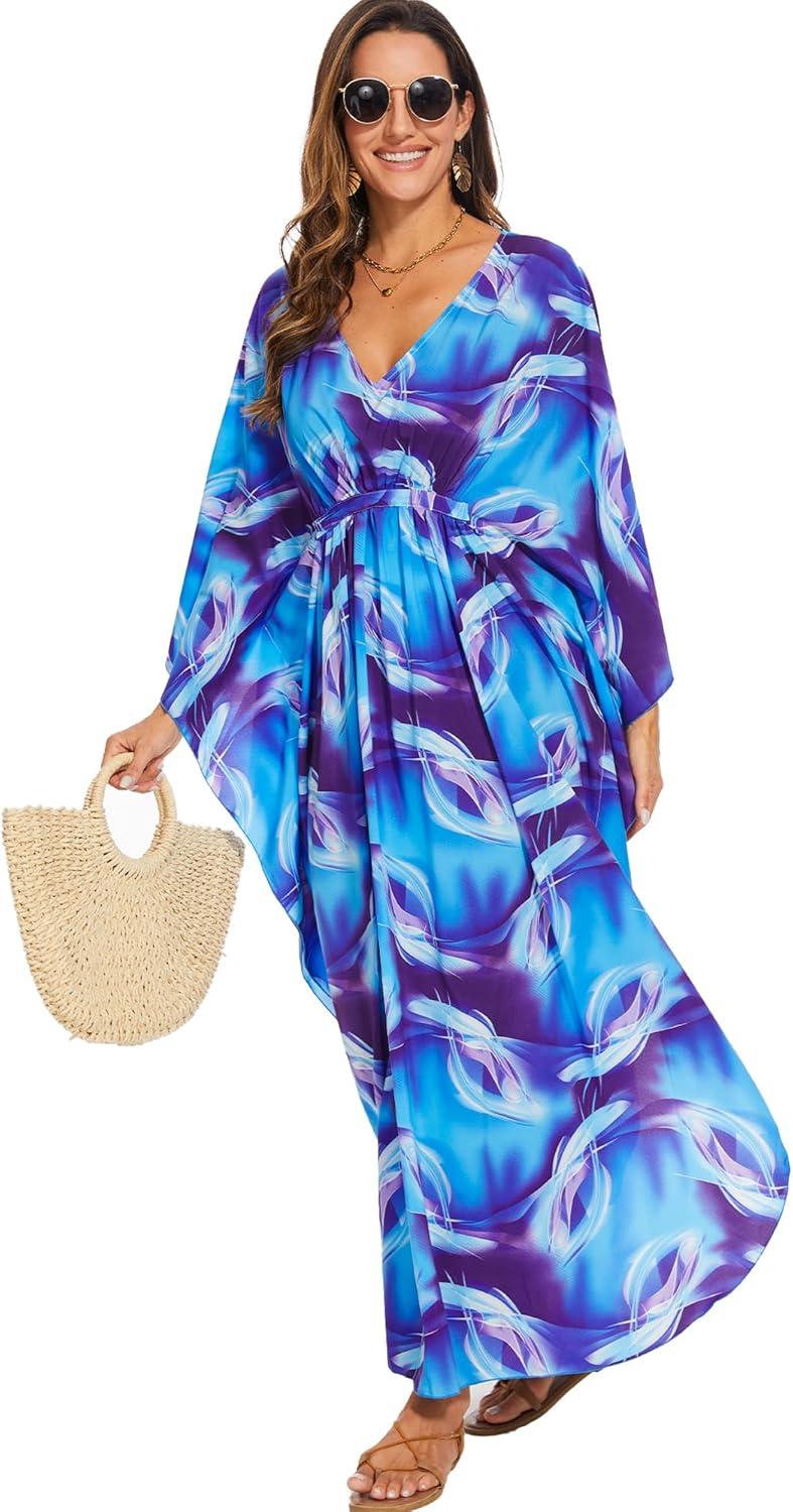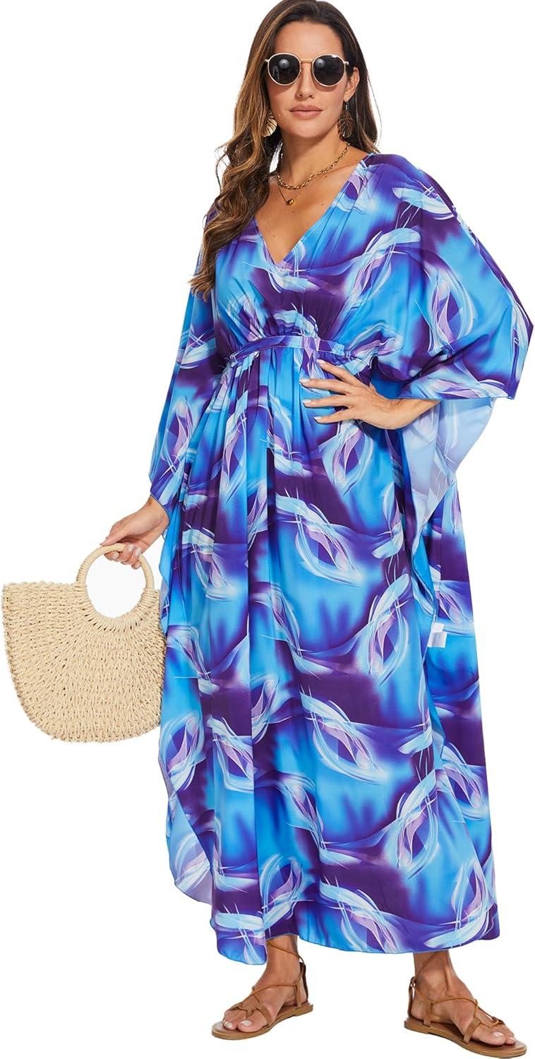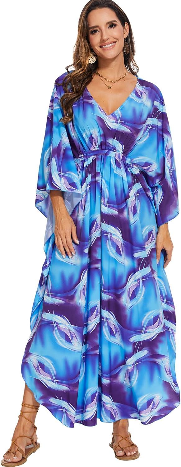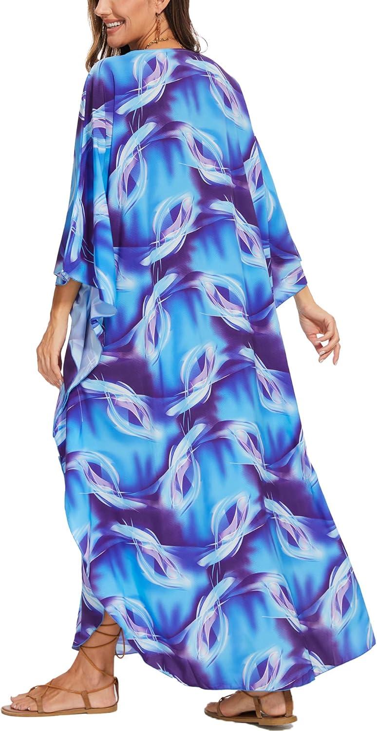 Moss Rose Kaftan Dresses for Women V Neck Summer Swimsuit Cover up Caftan Maxi Beach Dresses(A-blue)