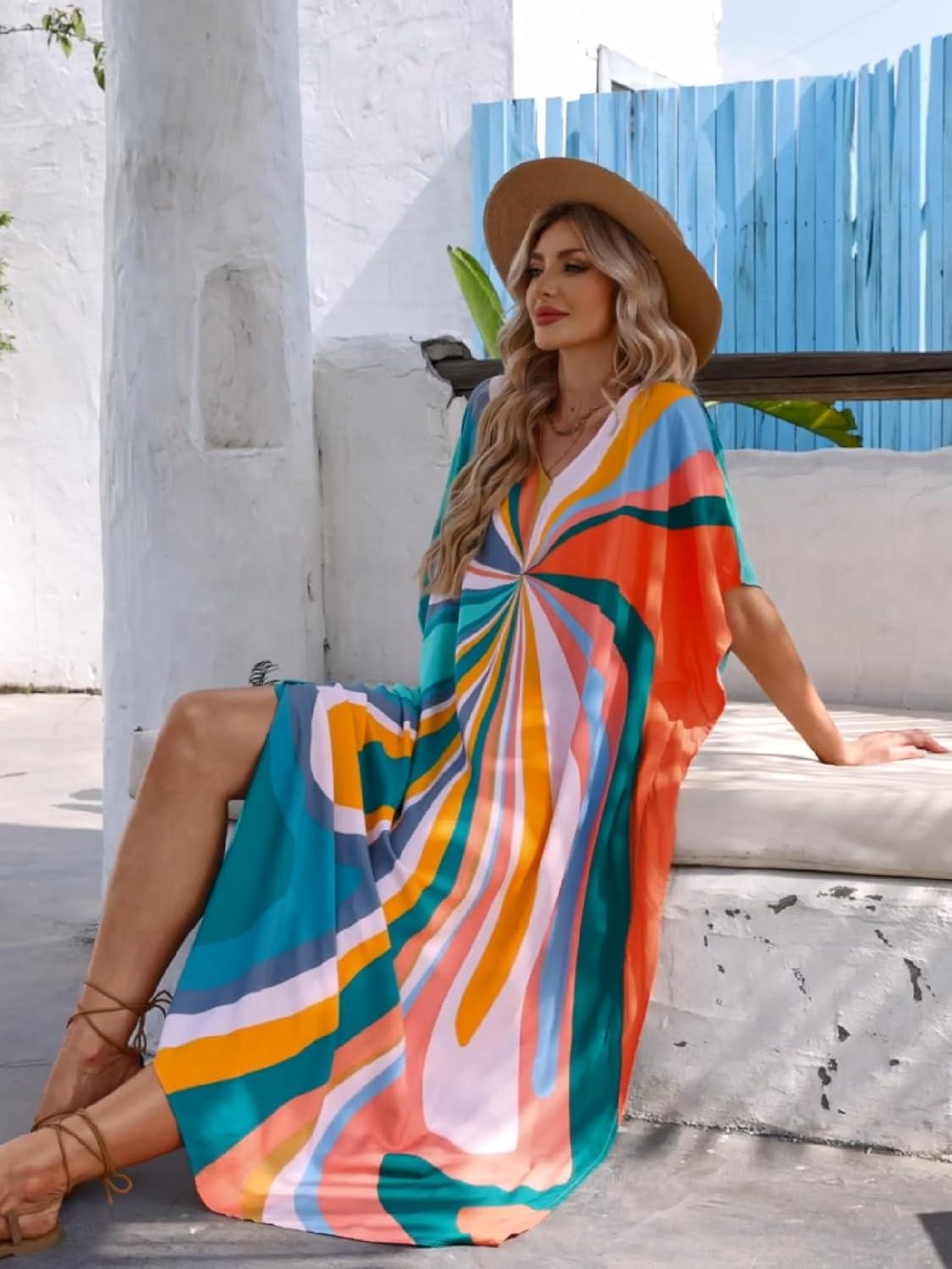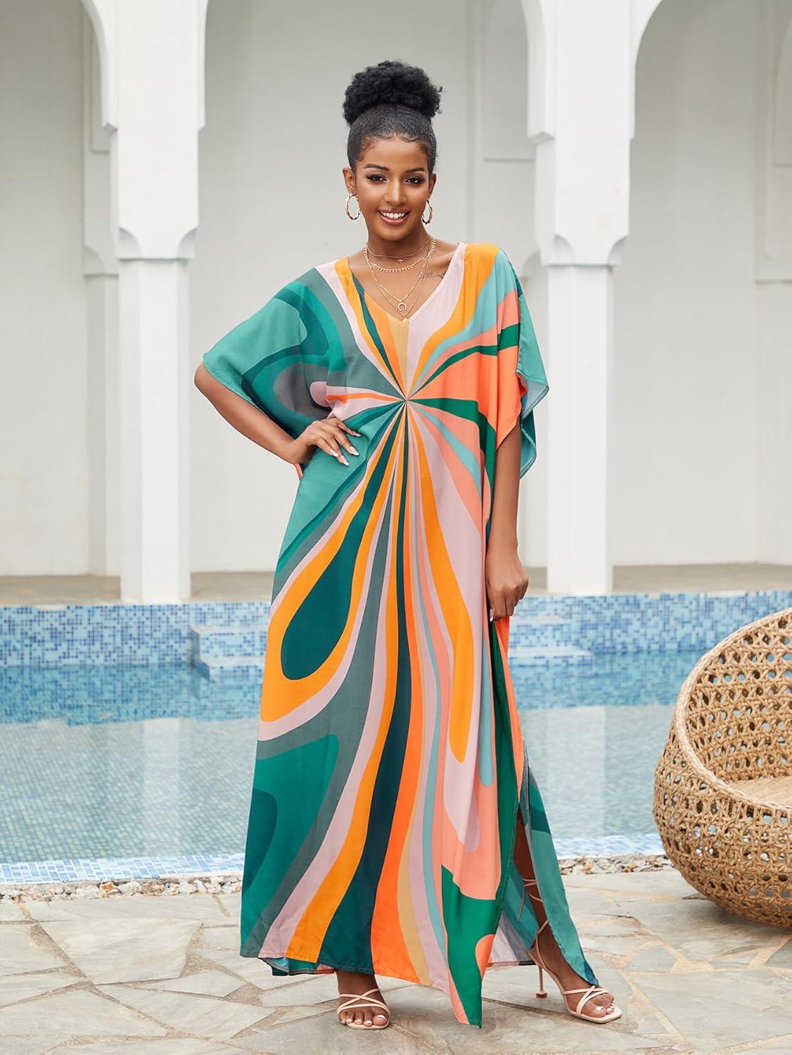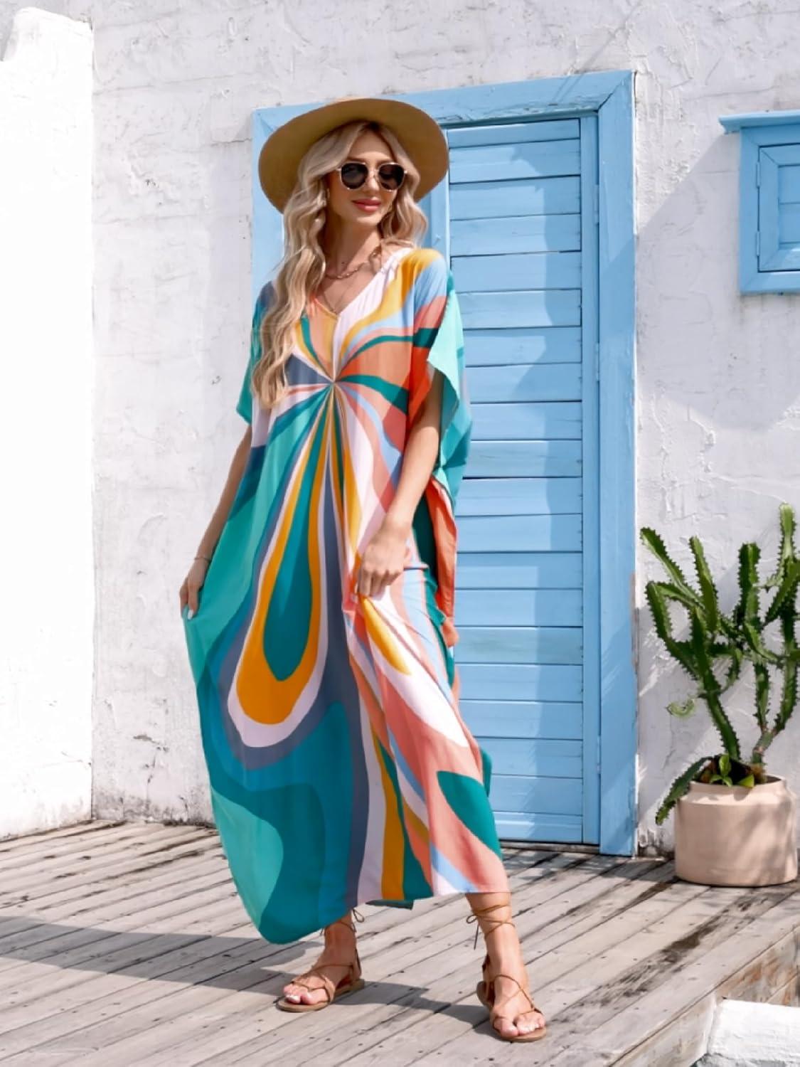 Moss Rose Kaftan Dresses for Women V Neck Summer Swimsuit Cover up Caftan Maxi Beach Dresses(A-colorful 1)