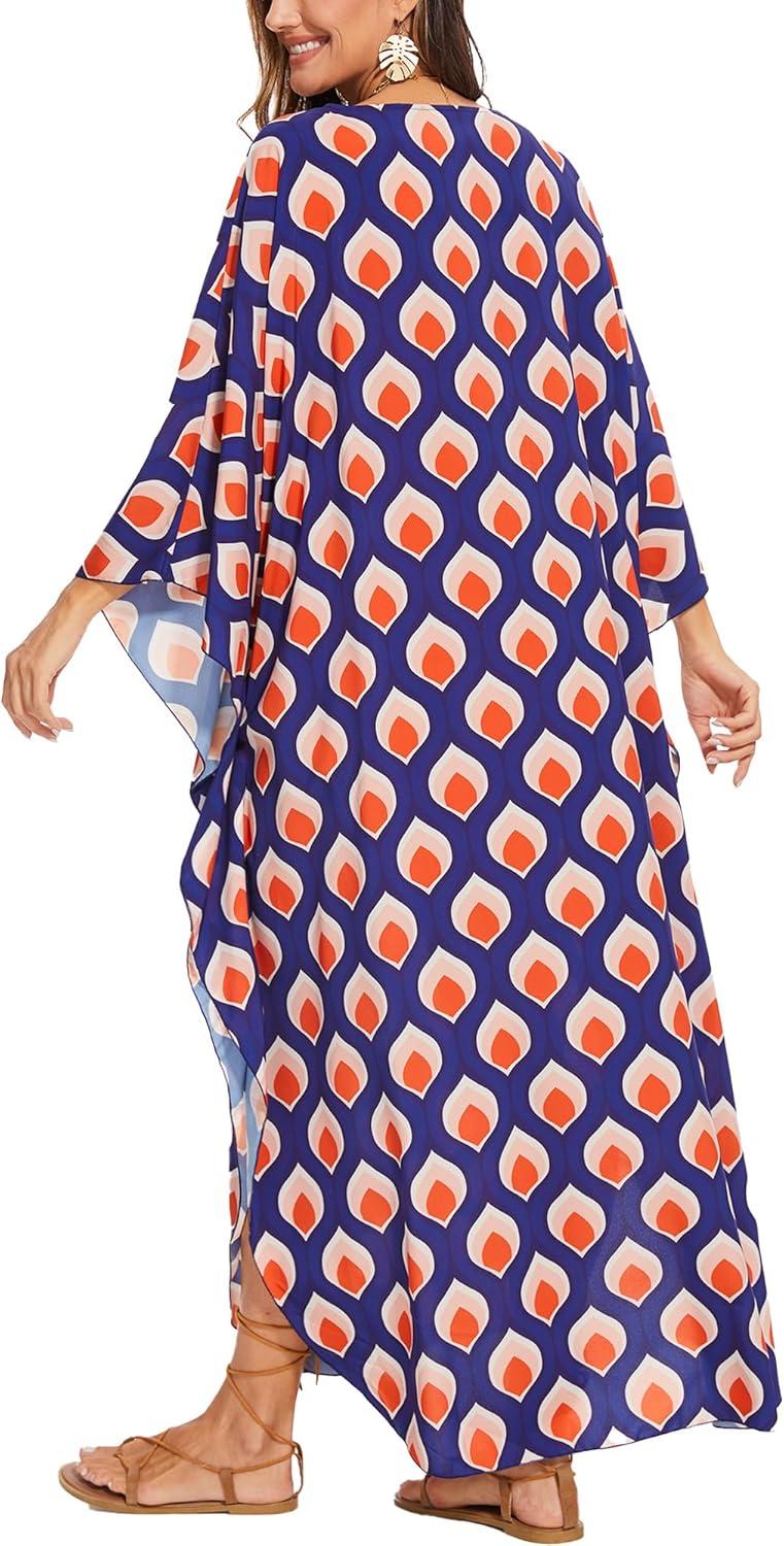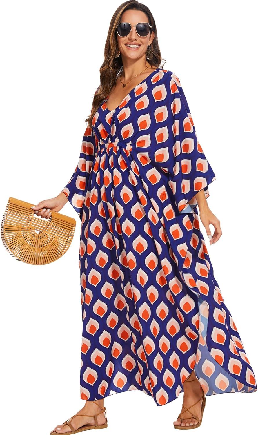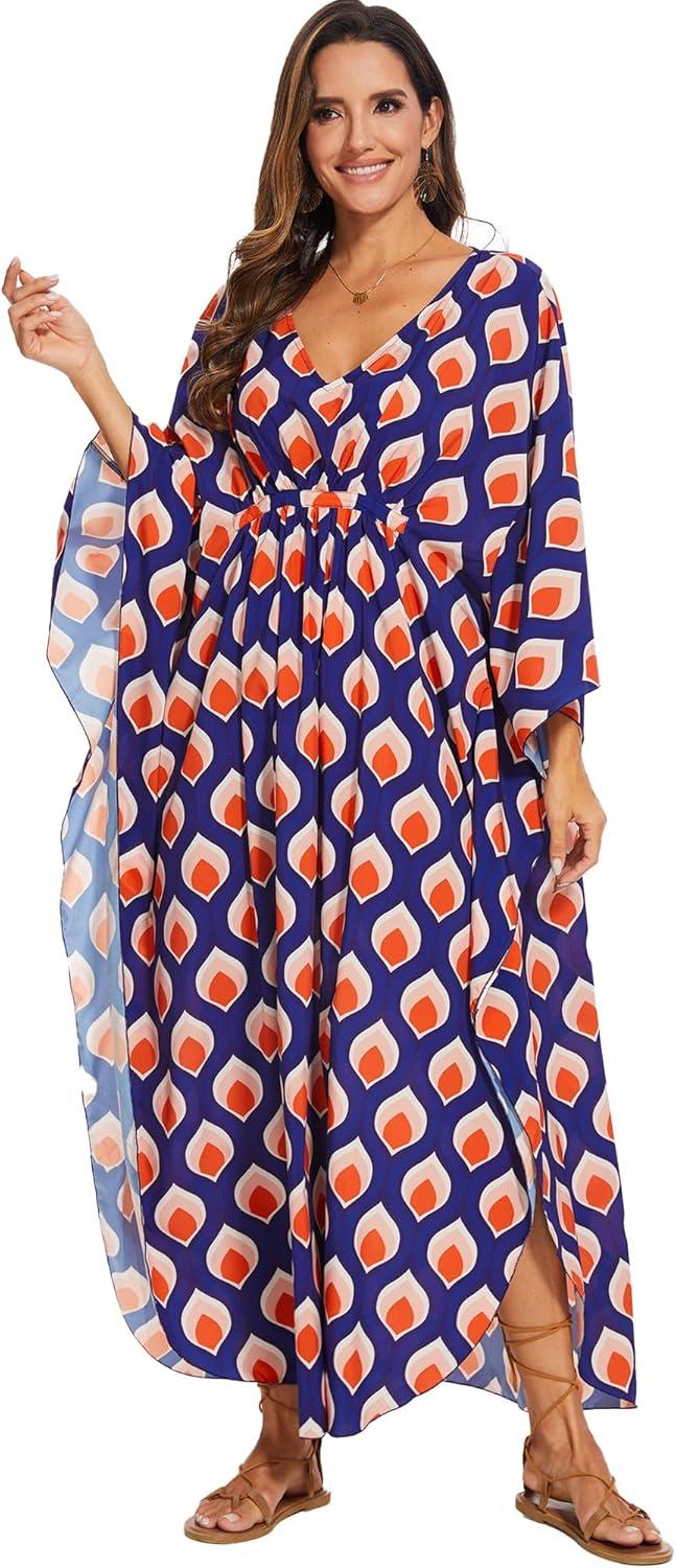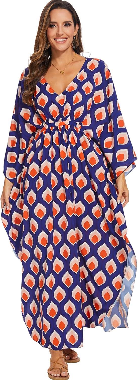 Moss Rose Kaftan Dresses for Women V Neck Summer Swimsuit Cover up Caftan Maxi Beach Dresses(A-orange)