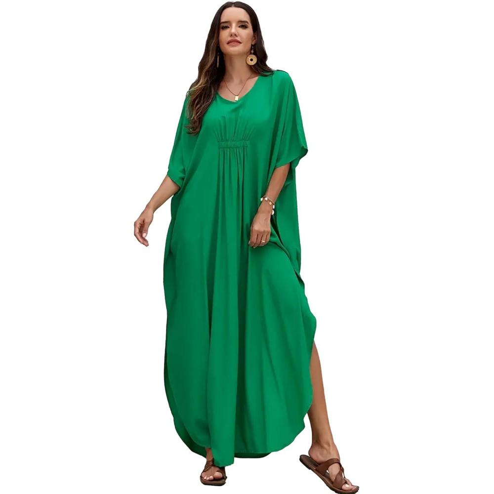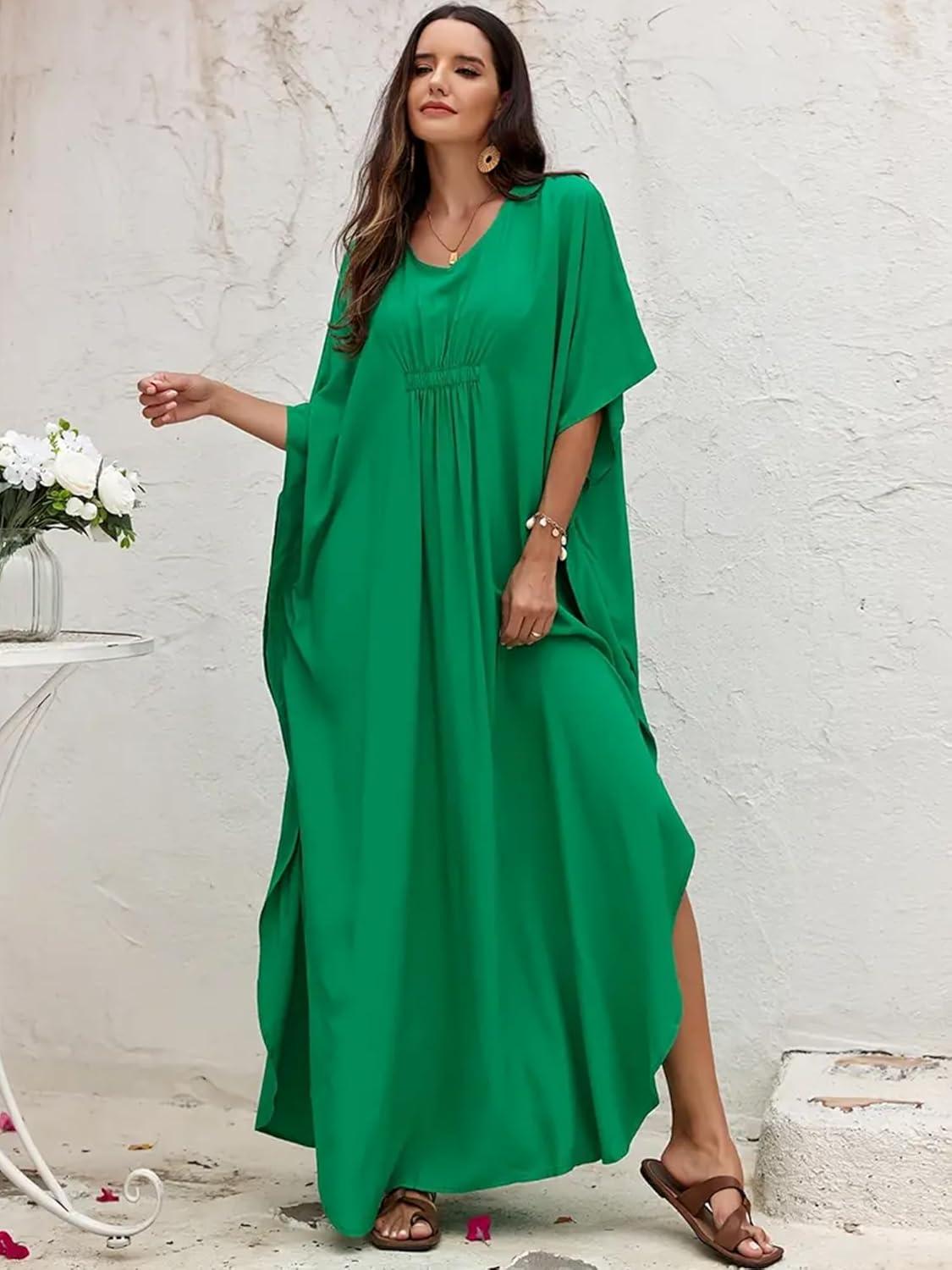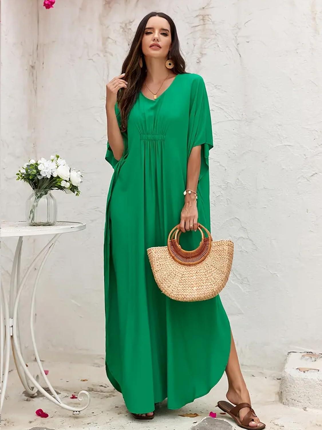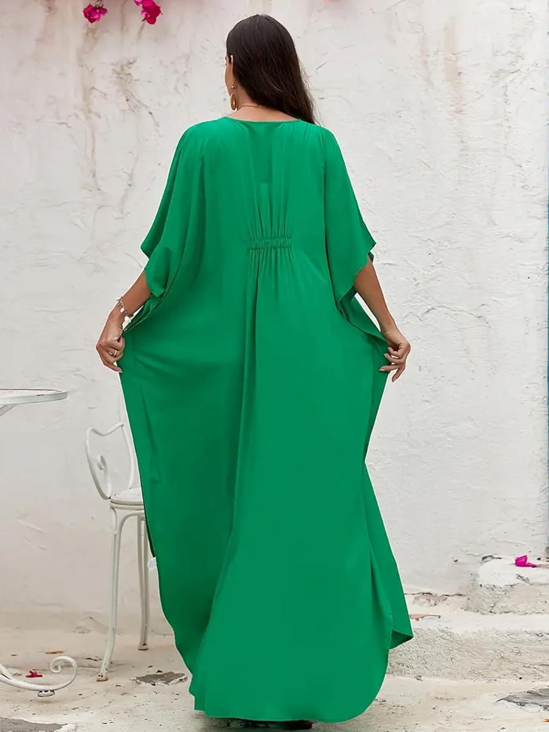 Moss Rose Kaftan Dresses for Women V Neck Summer Swimsuit Cover up Caftan Maxi Beach Dresses(C-dark Green)