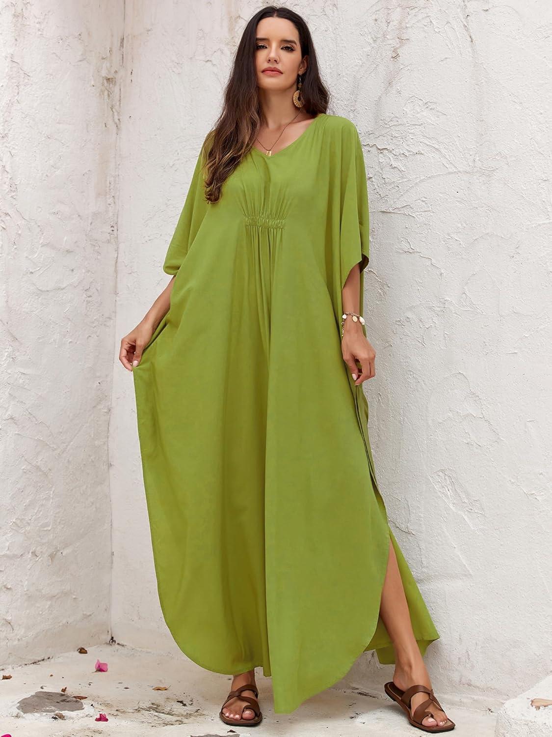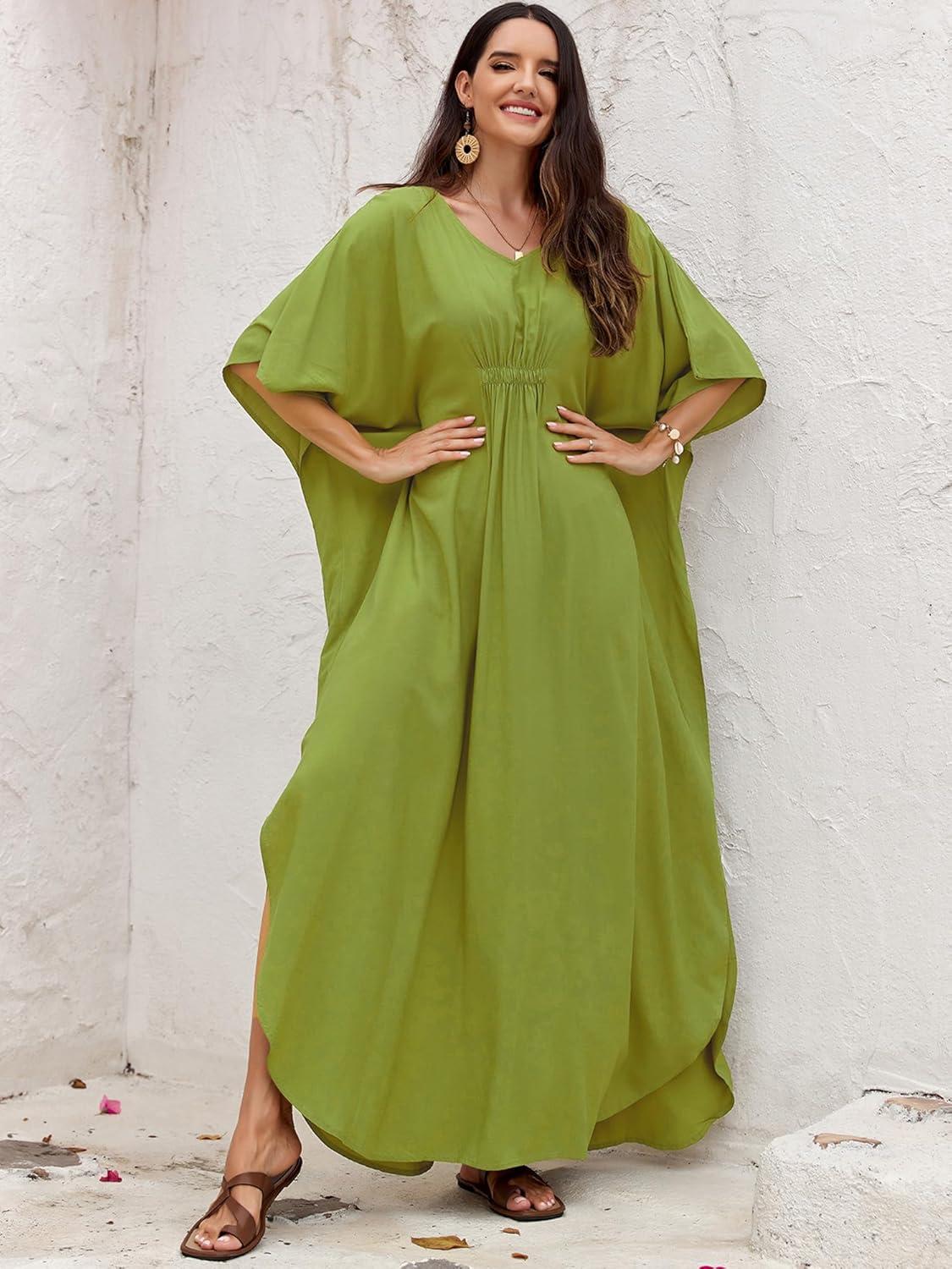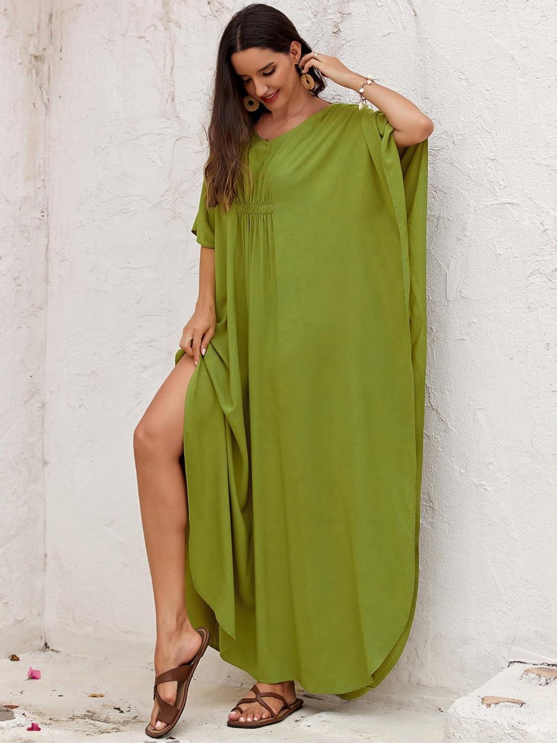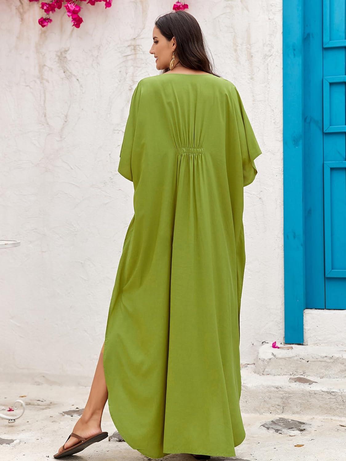 Moss Rose Kaftan Dresses for Women V Neck Summer Swimsuit Cover up Caftan Maxi Beach Dresses(C-grass Green*)