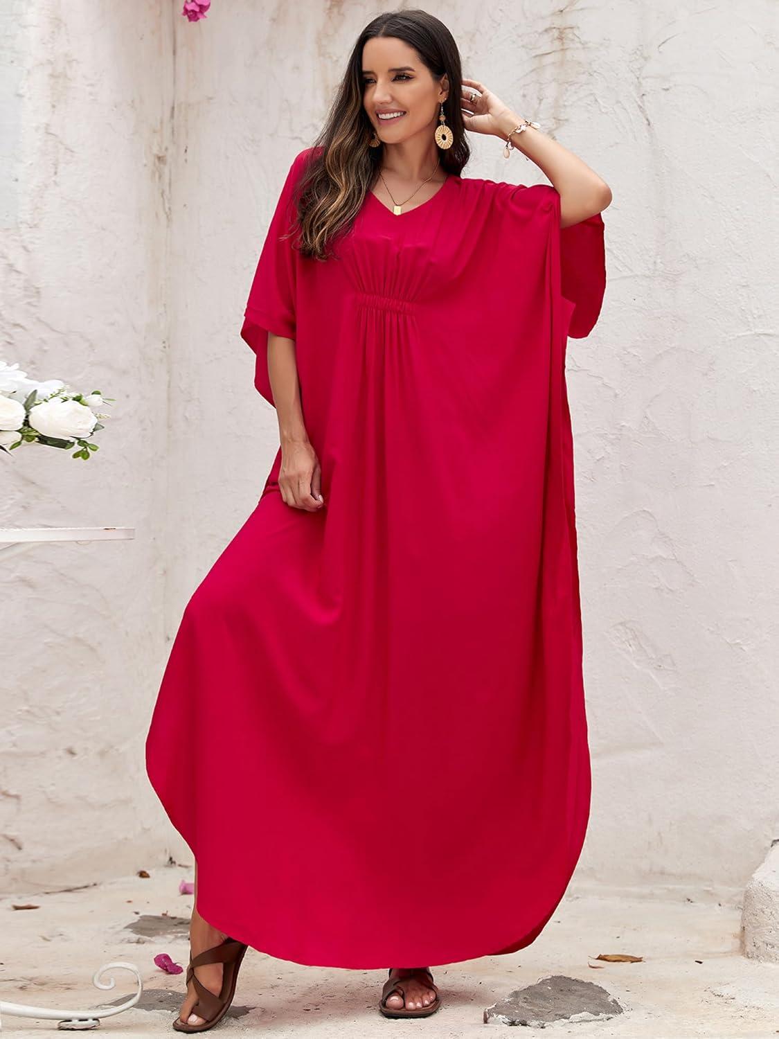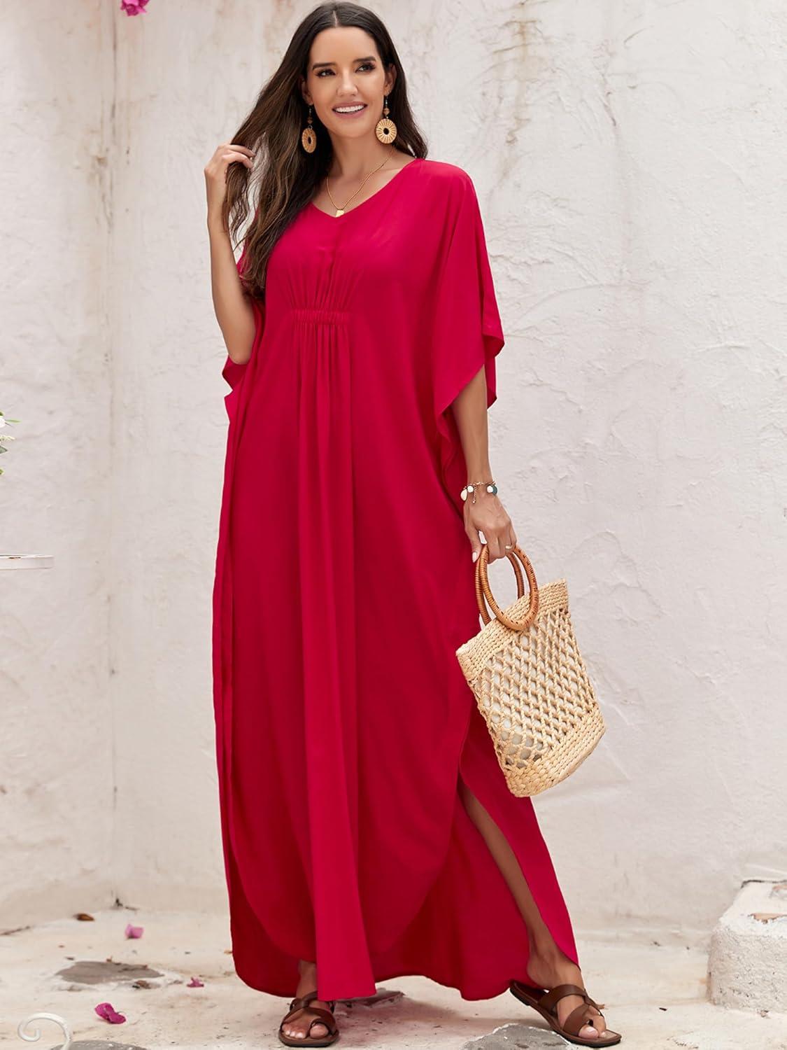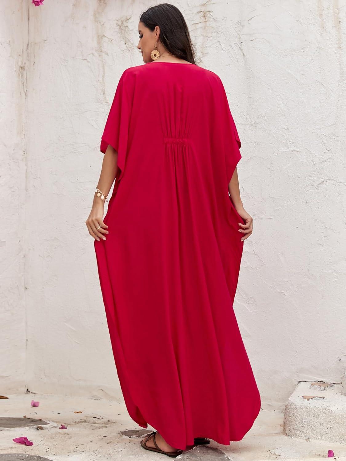 Moss Rose Kaftan Dresses for Women V Neck Summer Swimsuit Cover up Caftan Maxi Beach Dresses(C-red)