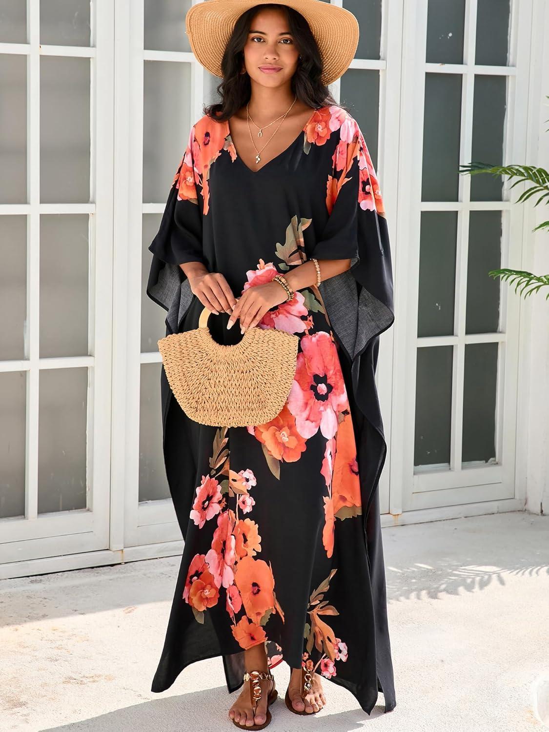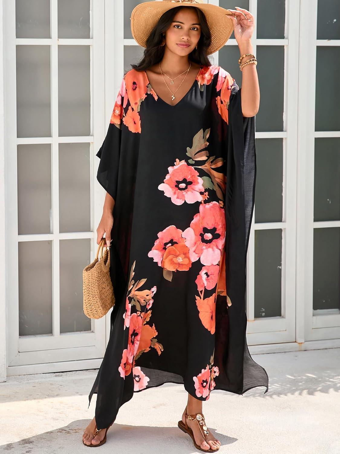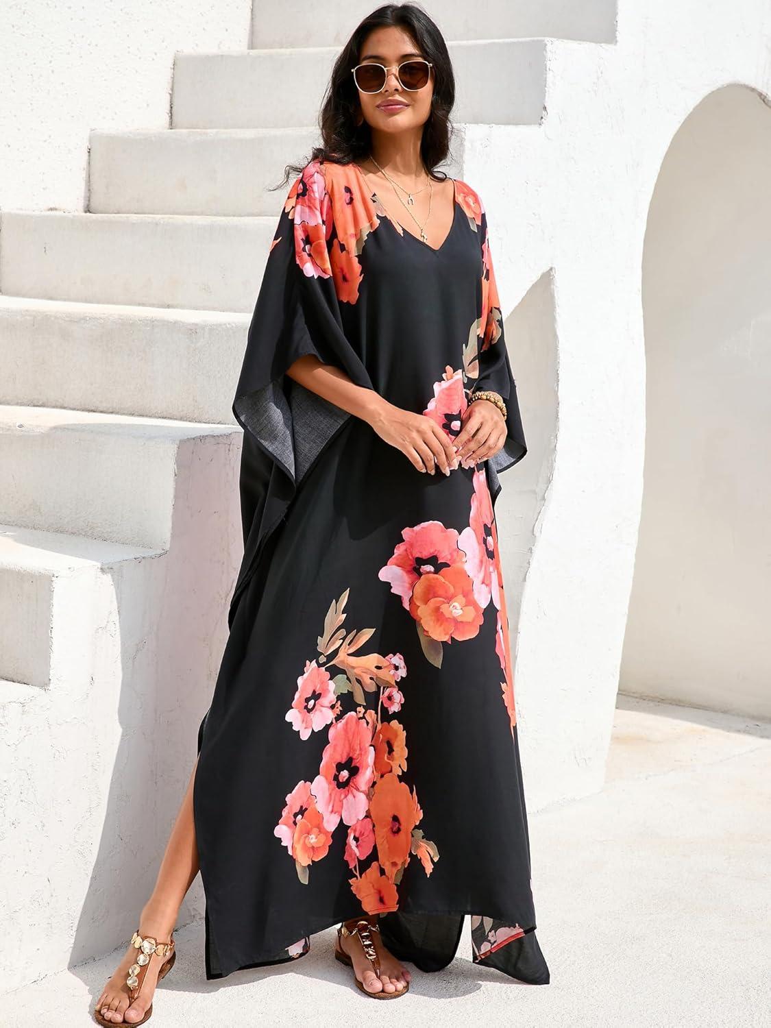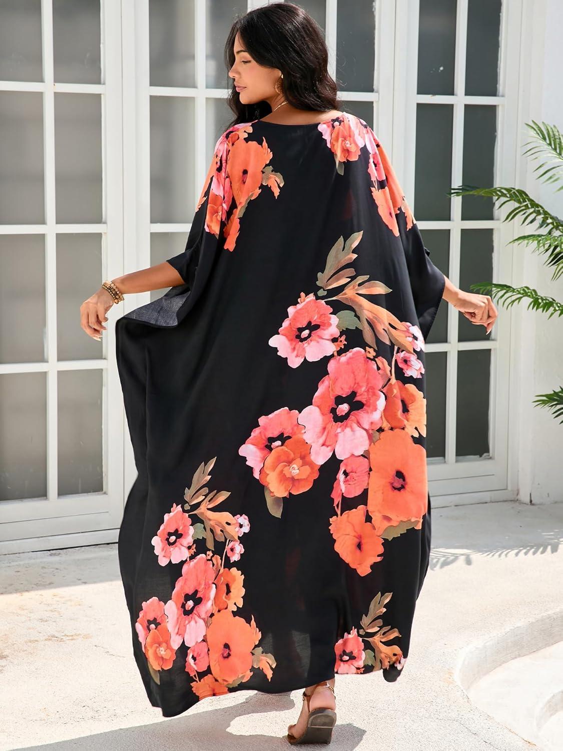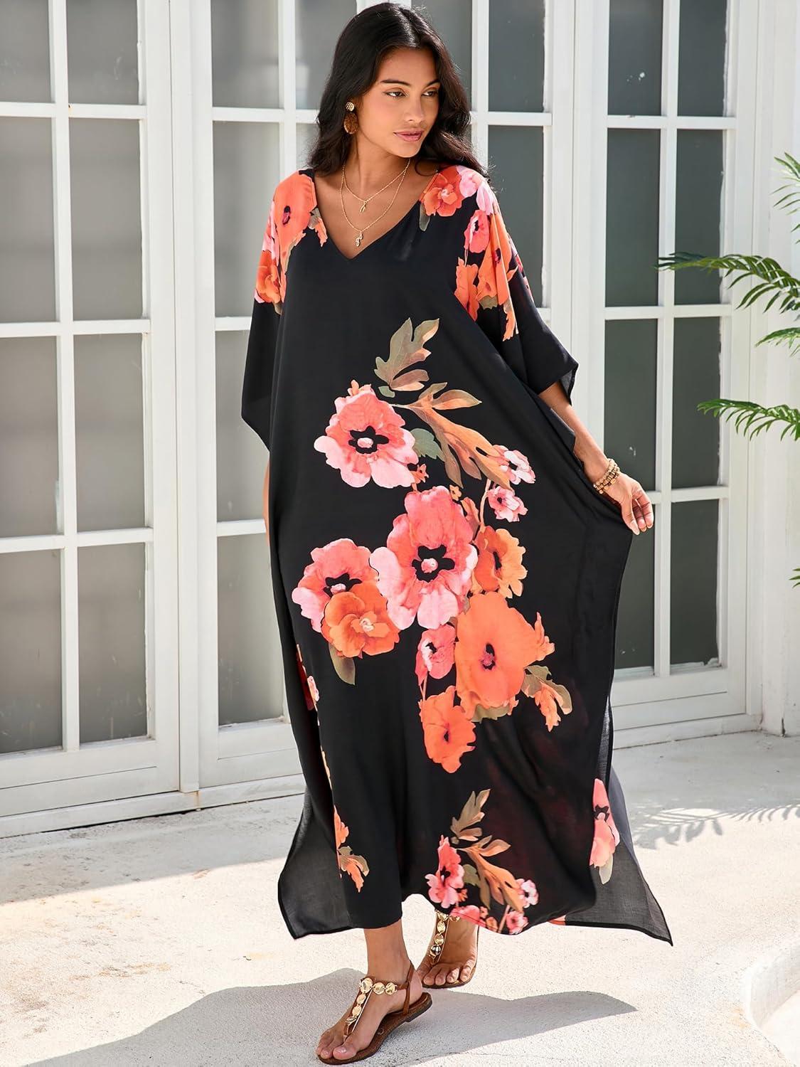 Moss Rose Kaftan Dresses for Women V Neck Summer Swimsuit Cover up Caftan Maxi Beach Dresses(D Black Red Flower)