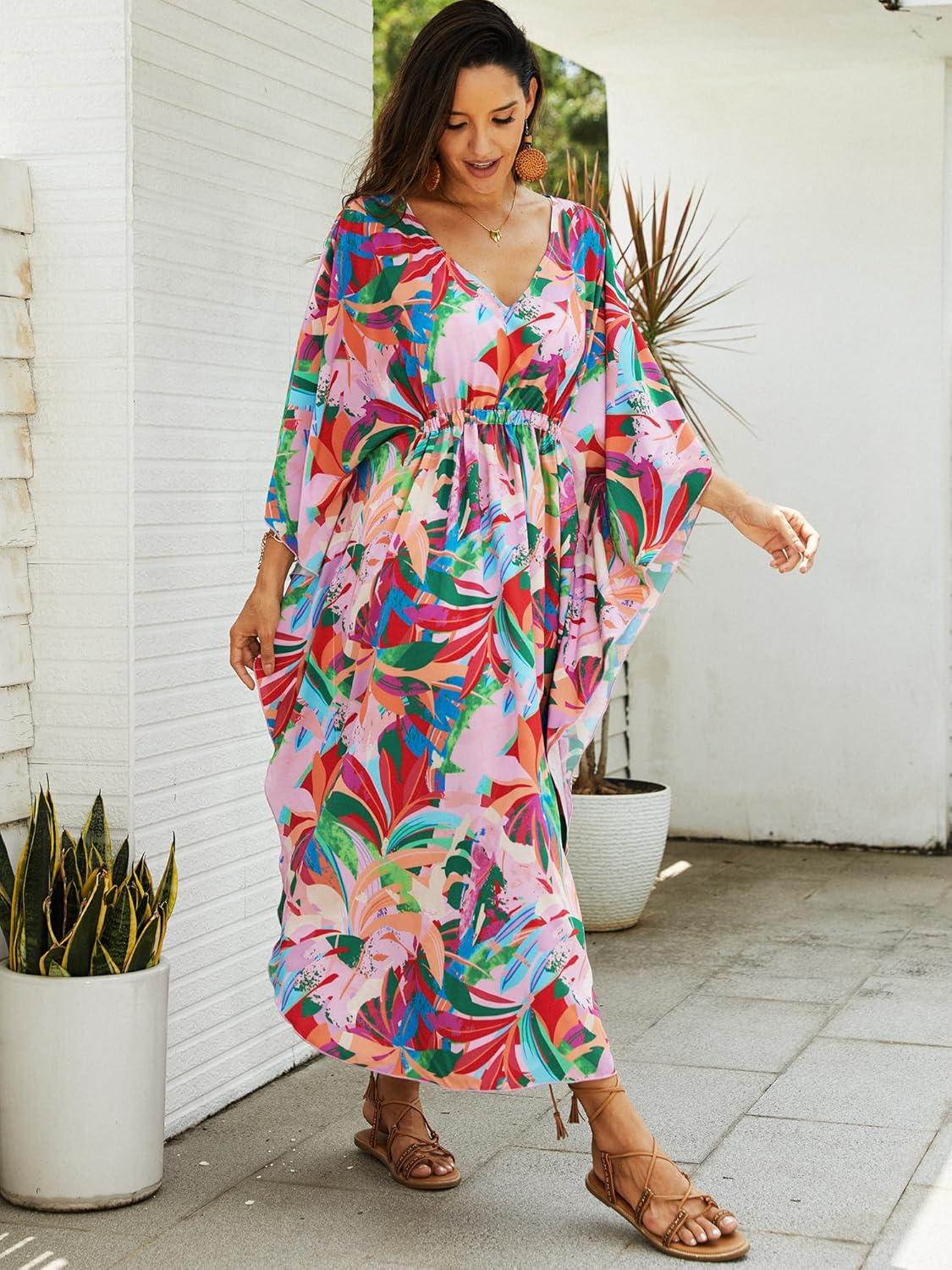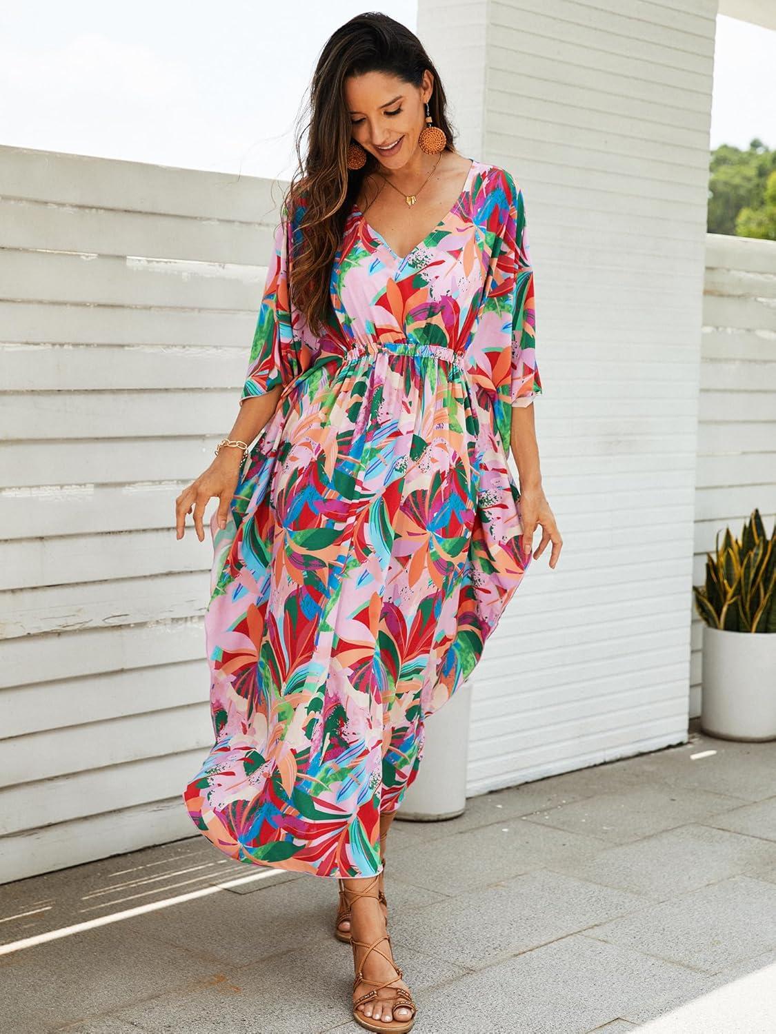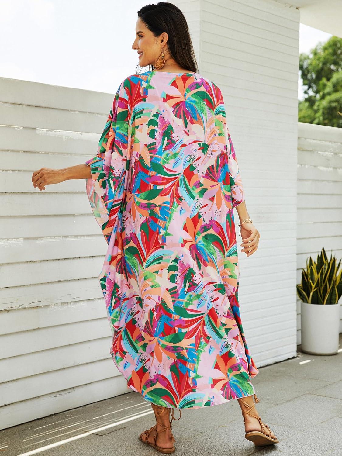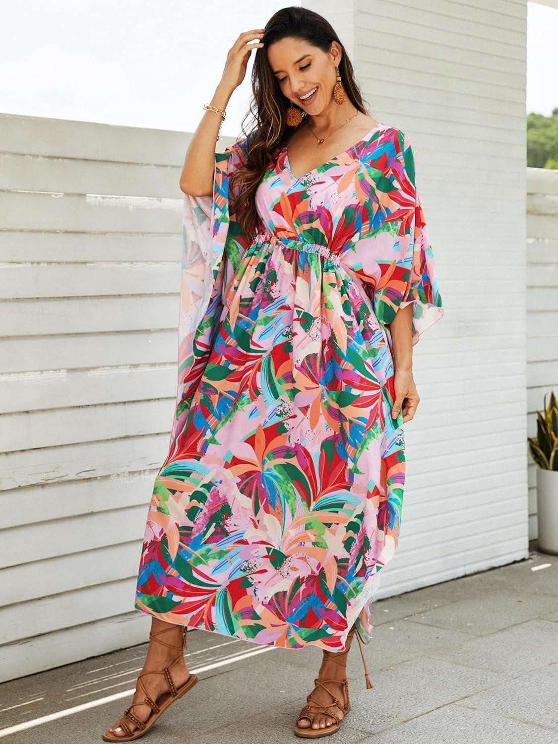 Moss Rose Kaftan Dresses for Women V Neck Summer Swimsuit Cover up Caftan Maxi Beach Dresses(D-colorful Red)