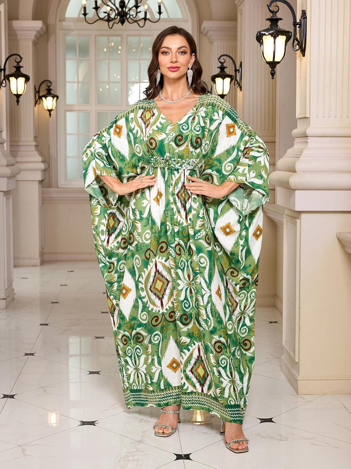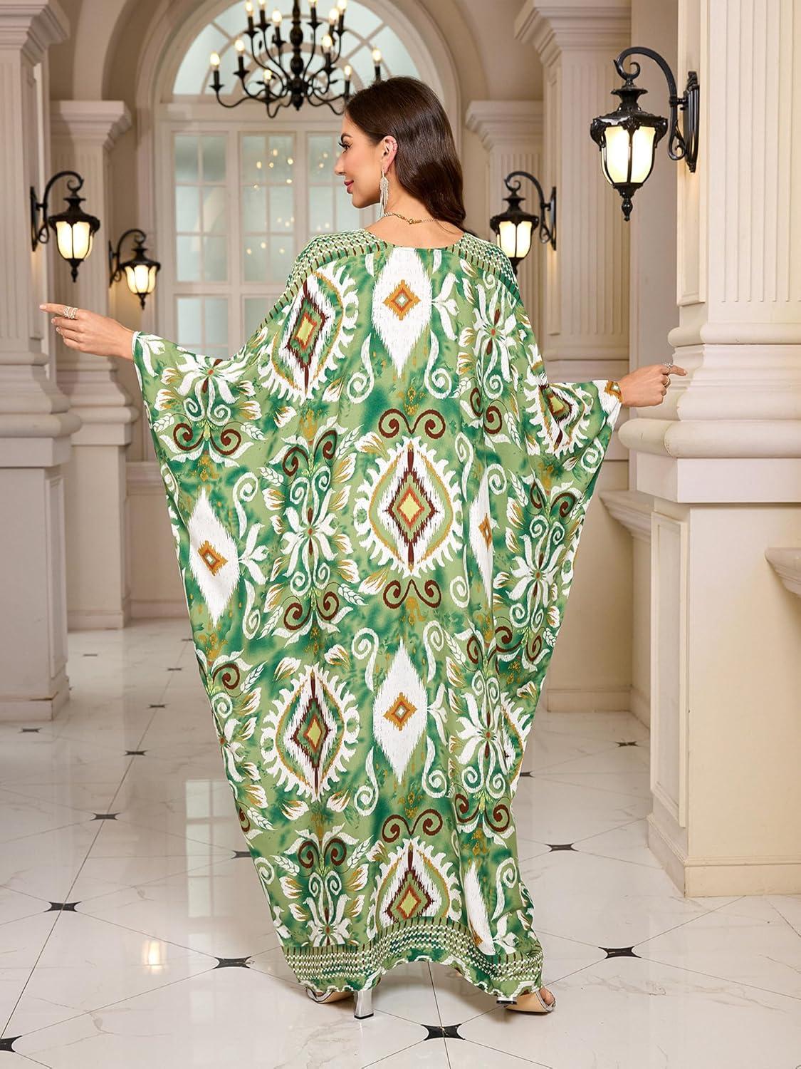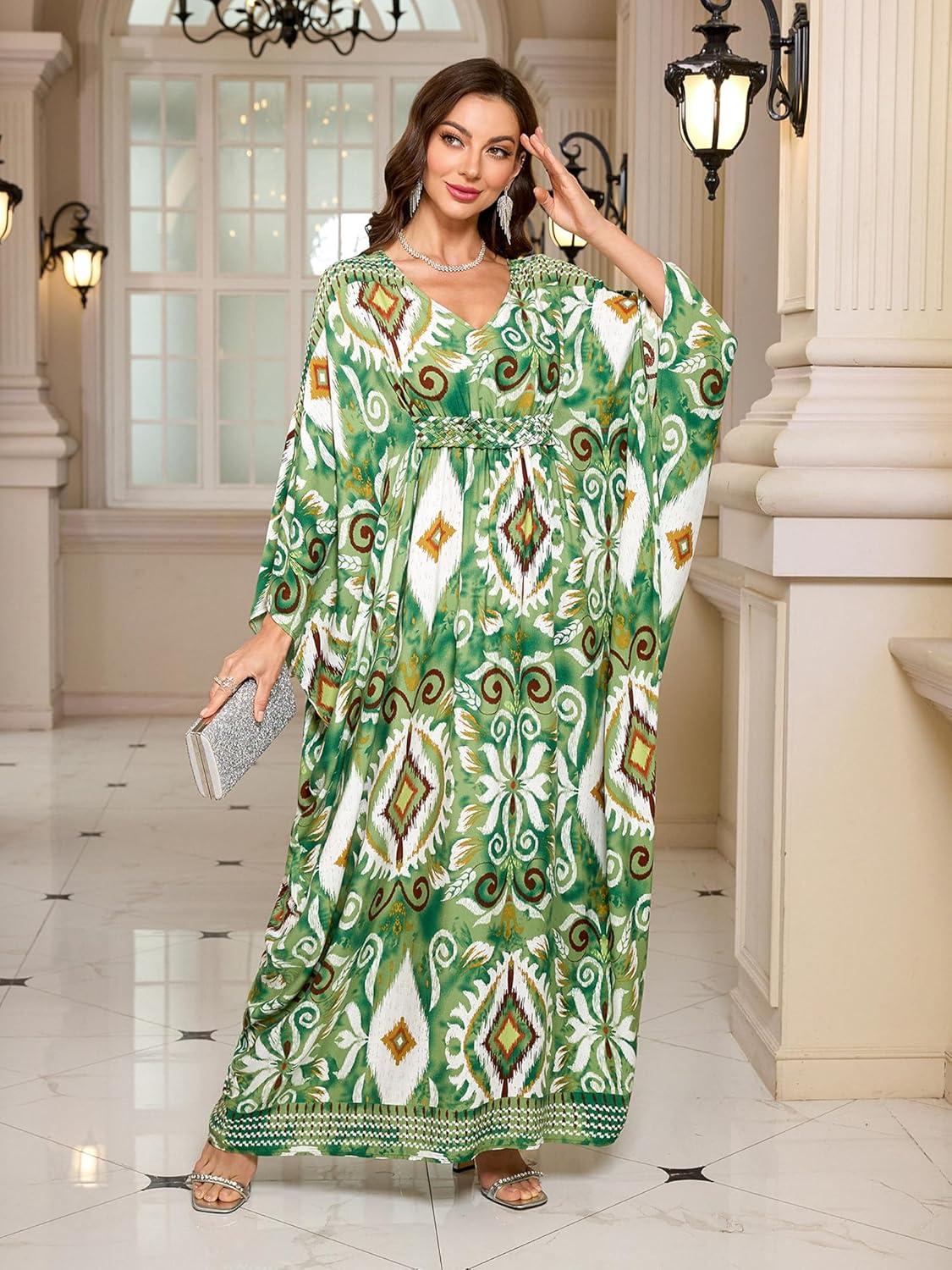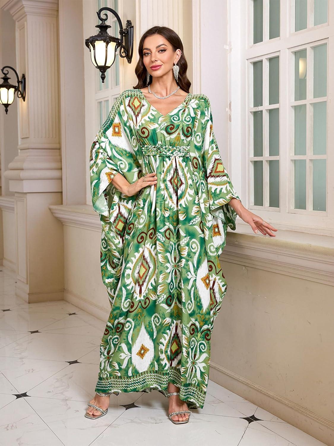 Moss Rose Kaftan Dresses for Women V Neck Summer Swimsuit Cover up Caftan Maxi Beach Dresses(D-green)