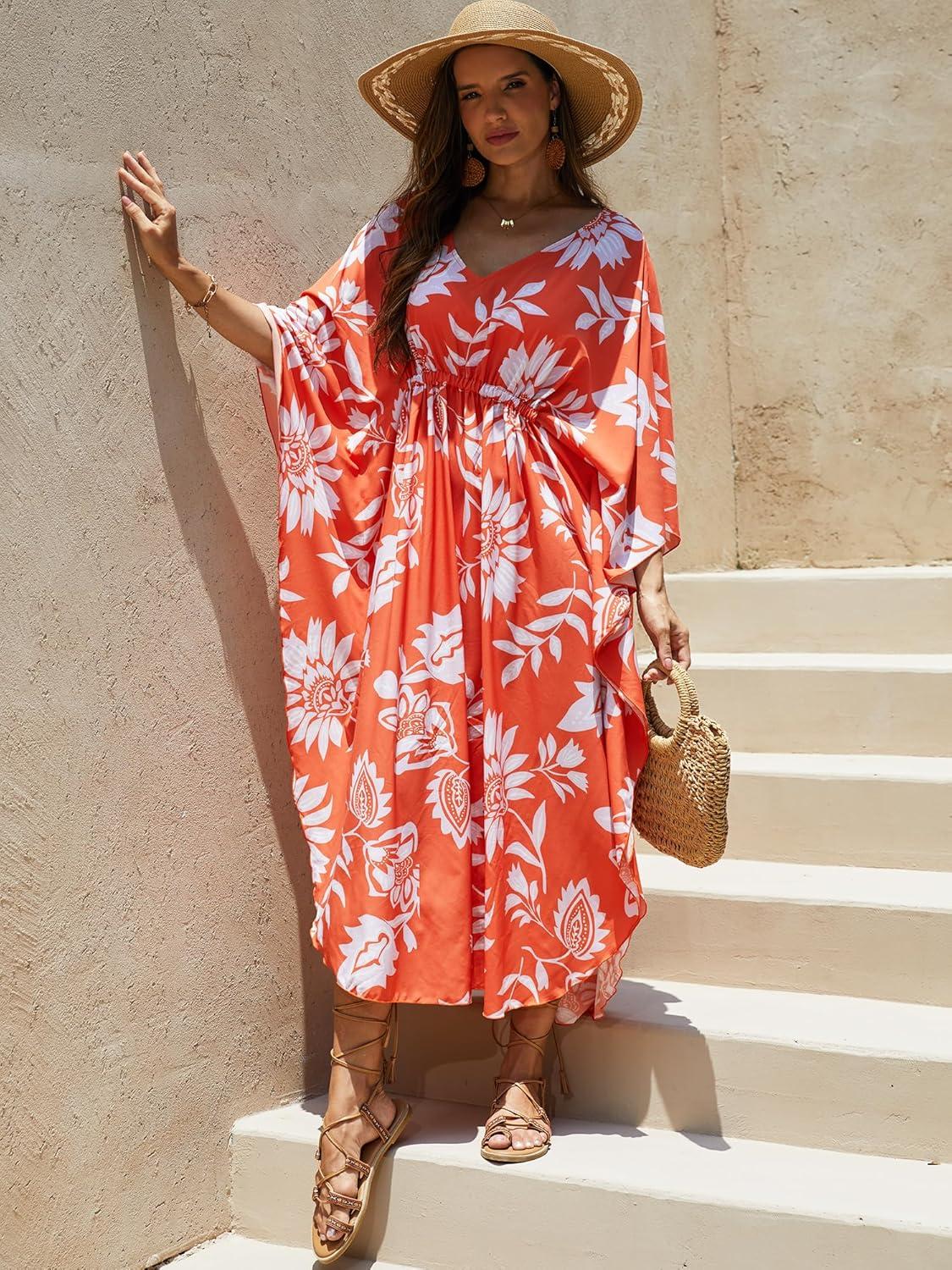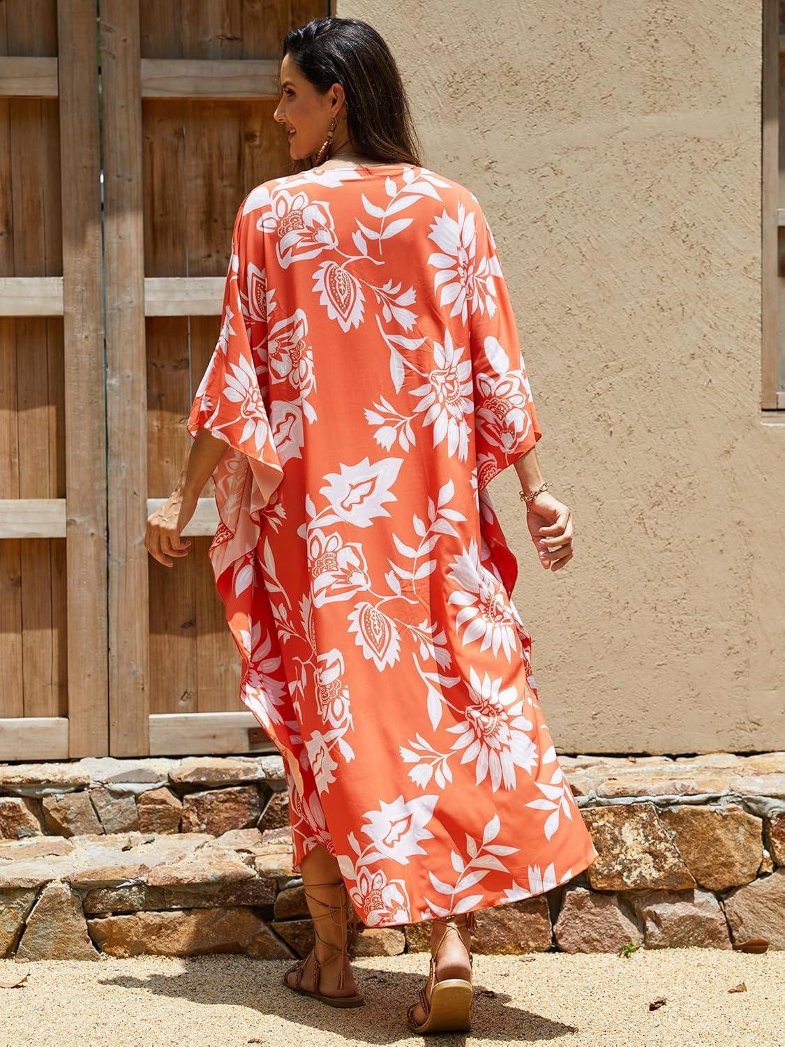 Moss Rose Kaftan Dresses for Women V Neck Summer Swimsuit Cover up Caftan Maxi Beach Dresses(D Orange Red)