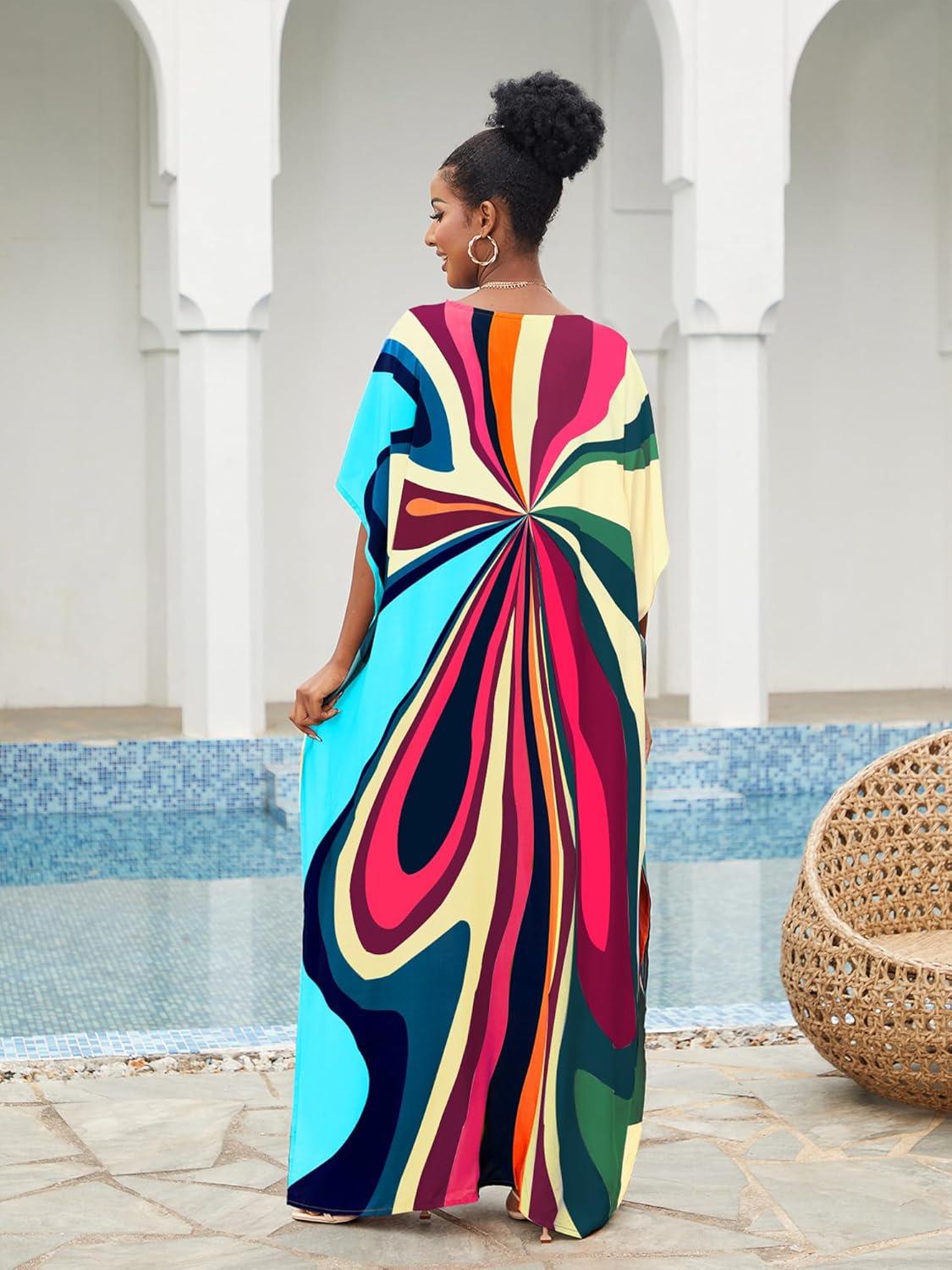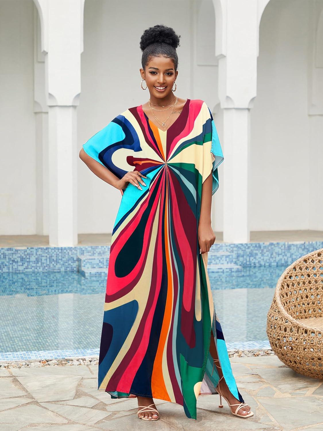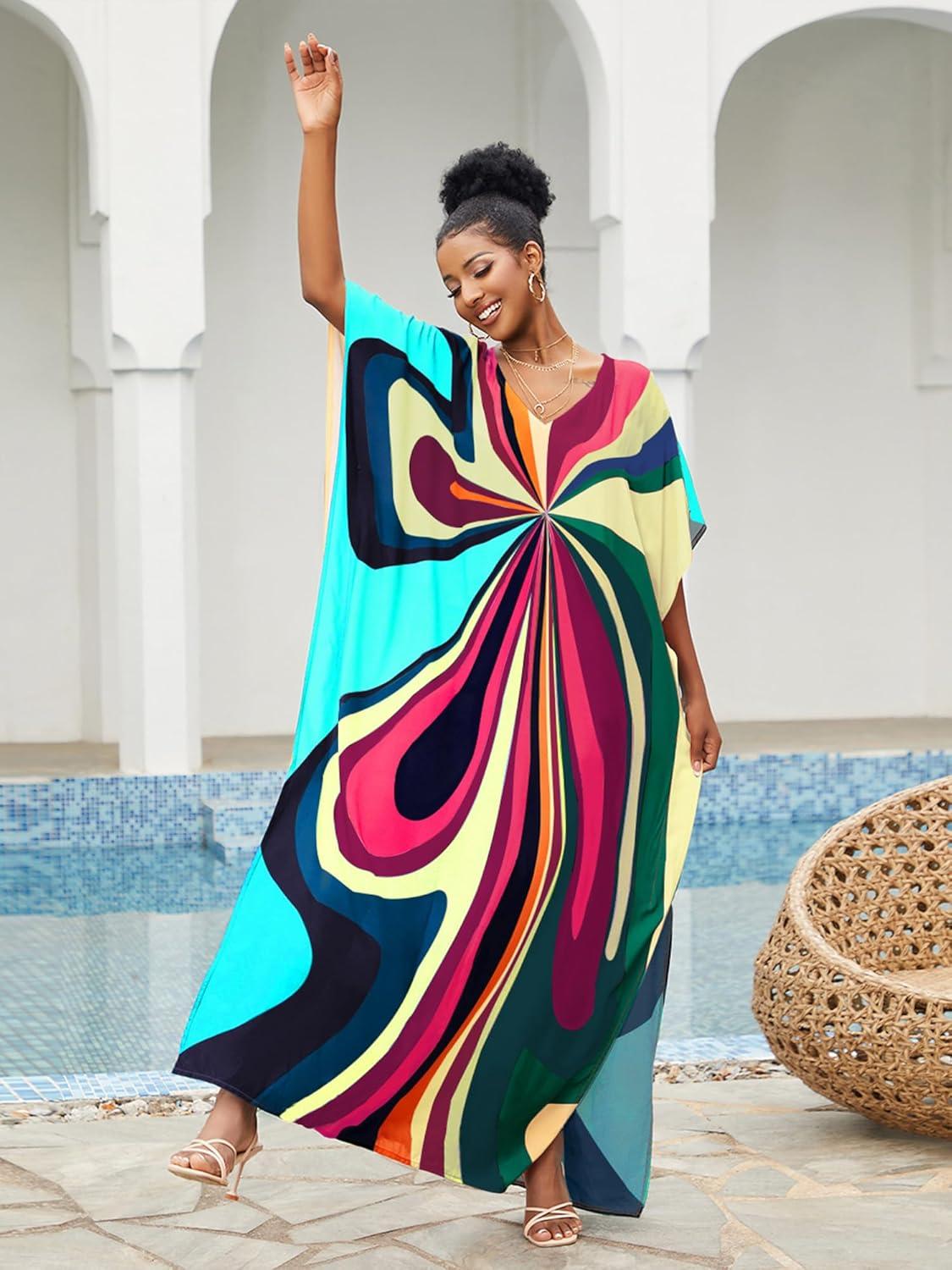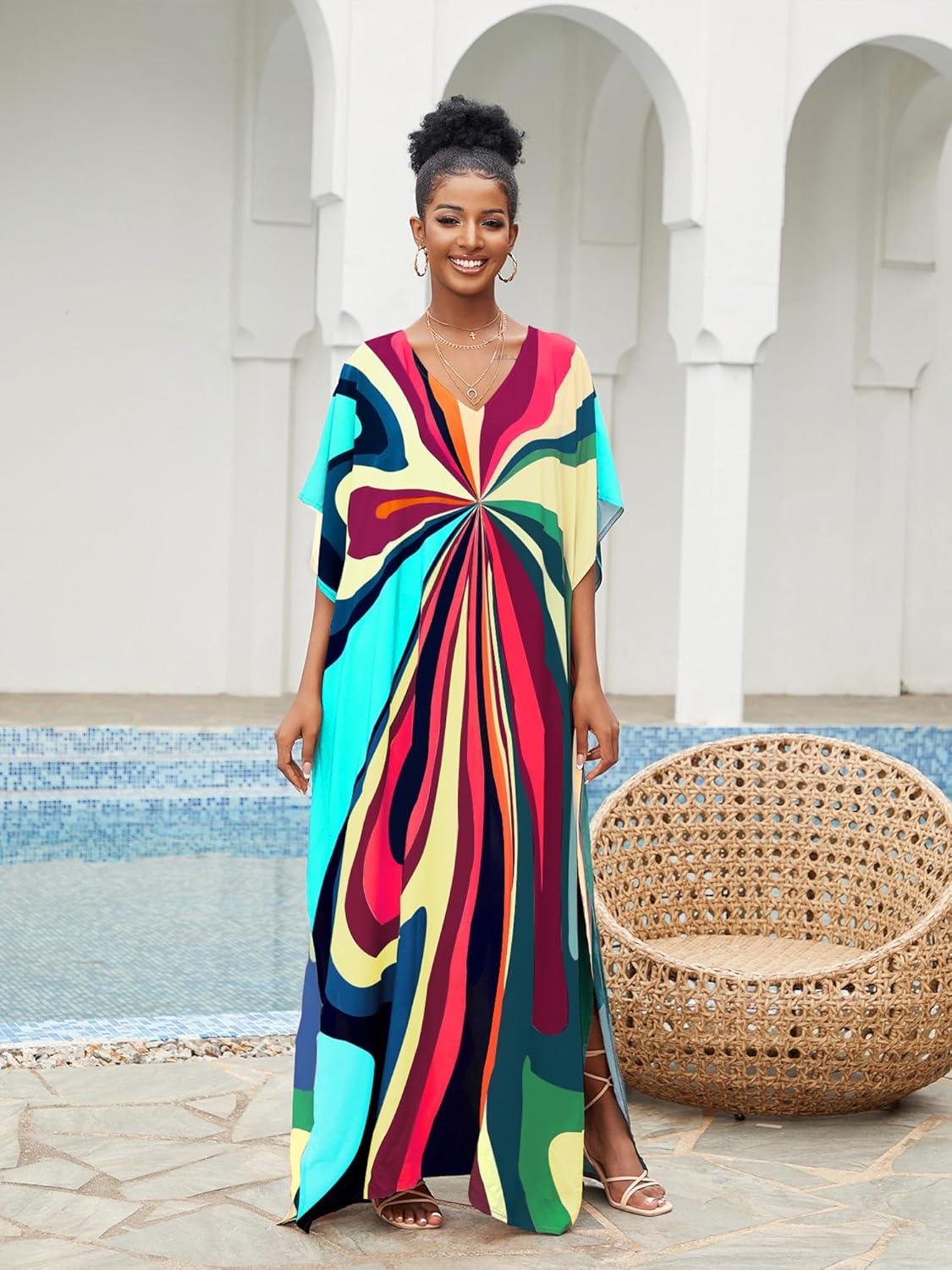 Moss Rose Kaftan Dresses for Women V Neck Summer Swimsuit Cover up Caftan Maxi Beach Dresses(E Colorful 5*)