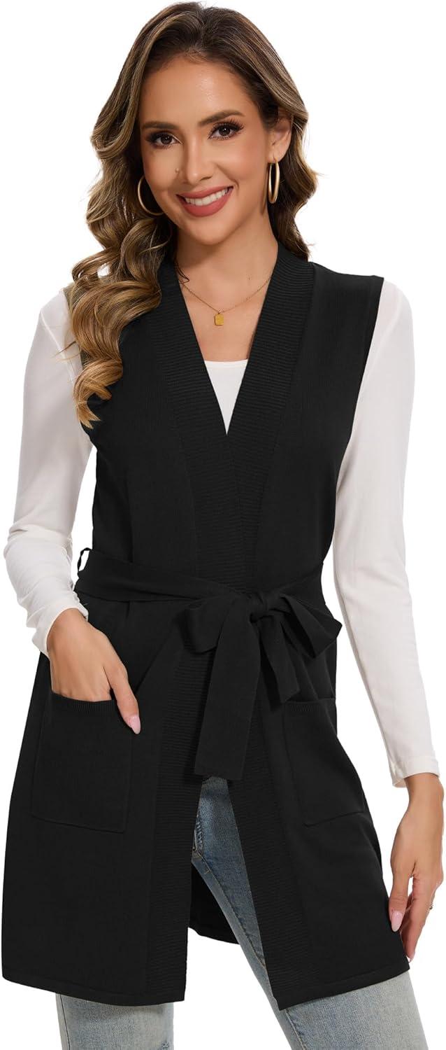 Moss Rose Long Vest for Women Sleeveless Cardigans Ribbed Knit Outwear with Belt and Pockets(Black)