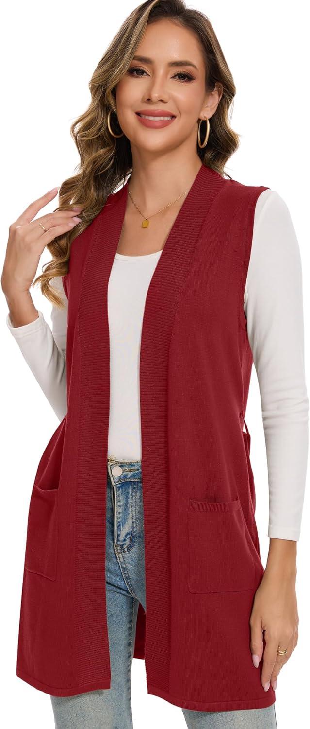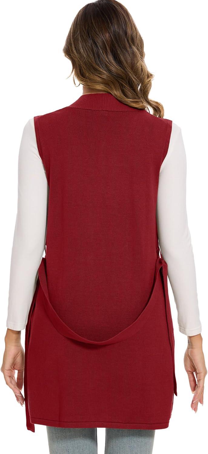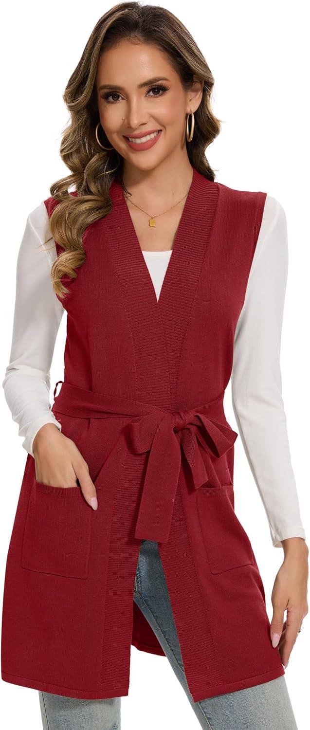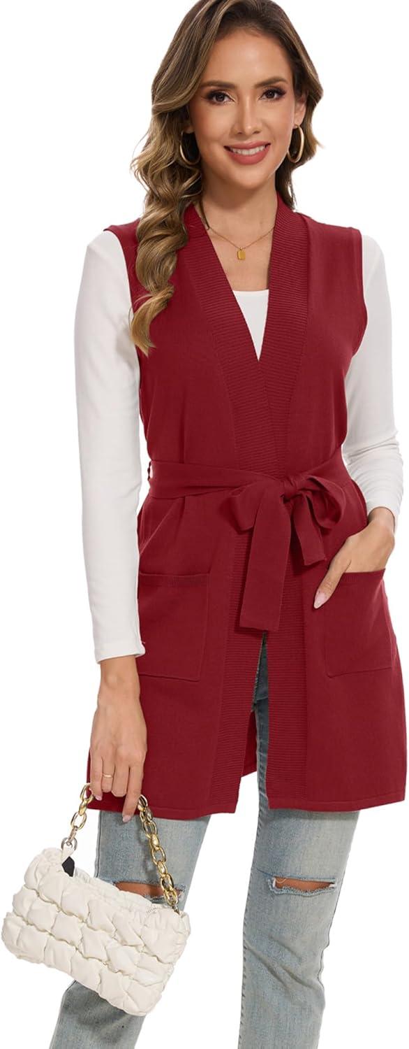 Moss Rose Long Vest for Women Sleeveless Cardigans Ribbed Knit Outwear with Belt and Pockets(Wine Red)