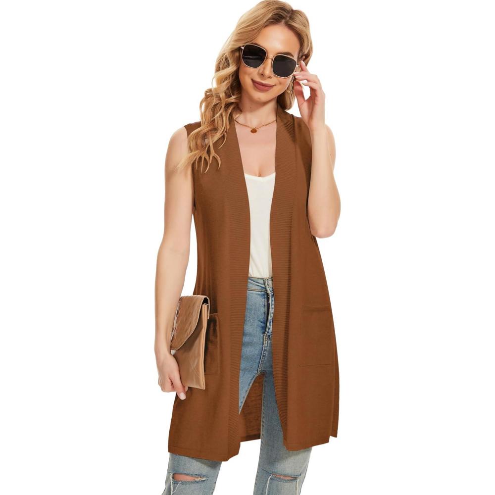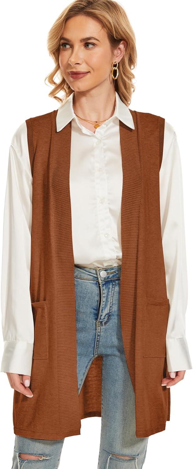 Moss Rose Long Vest for Women Sleeveless Lightweight Open Front Cardigans Ribbed Knit Outwear with Pockets(Coffee)