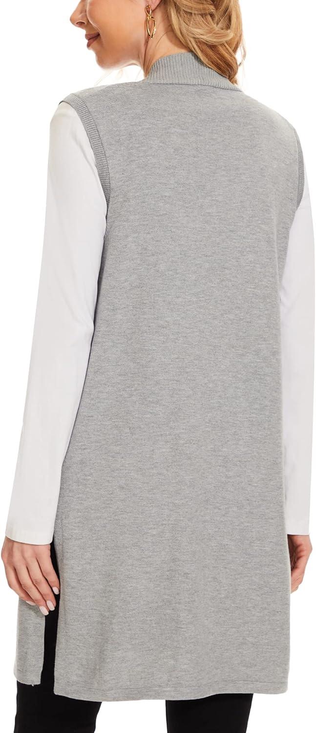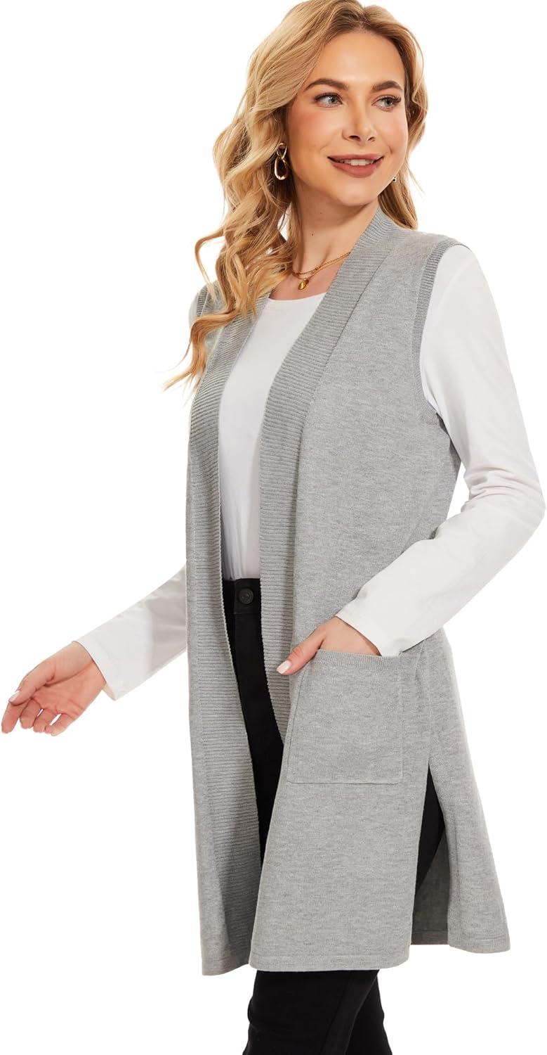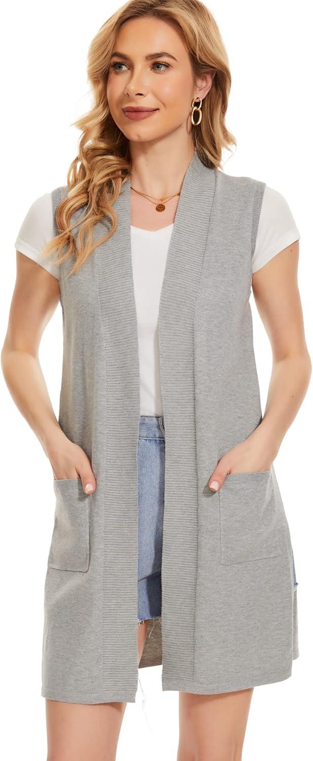 Moss Rose Long Vest for Women Sleeveless Lightweight Open Front Cardigans Ribbed Knit Outwear with Pockets(Gray)