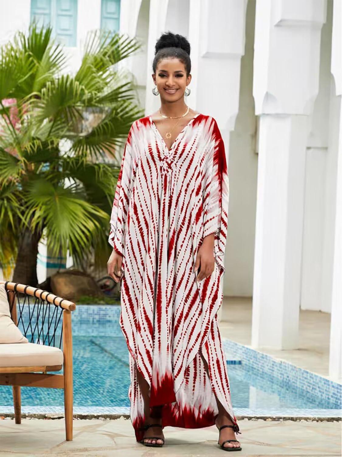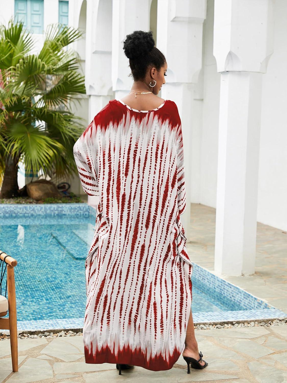Moss Rose Women Summer Caftan Coverups Dress Kimono Beach Vacation Wear V Neck Print Maxi Boho Dress(B-red)