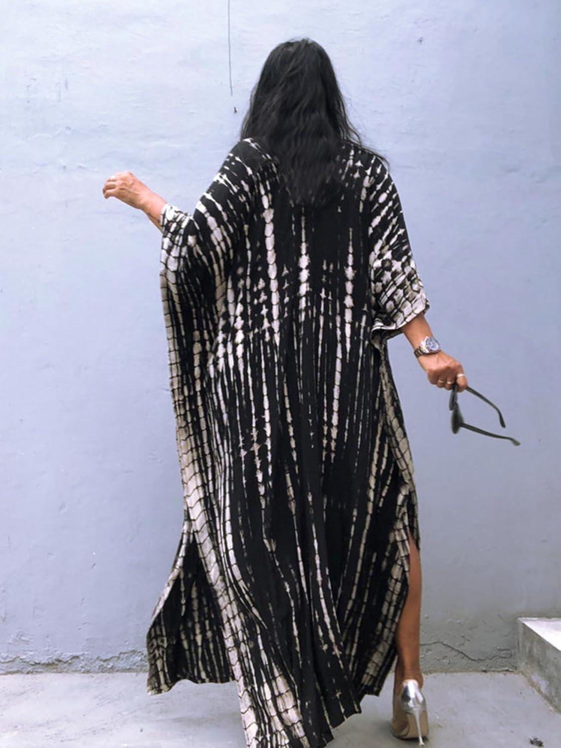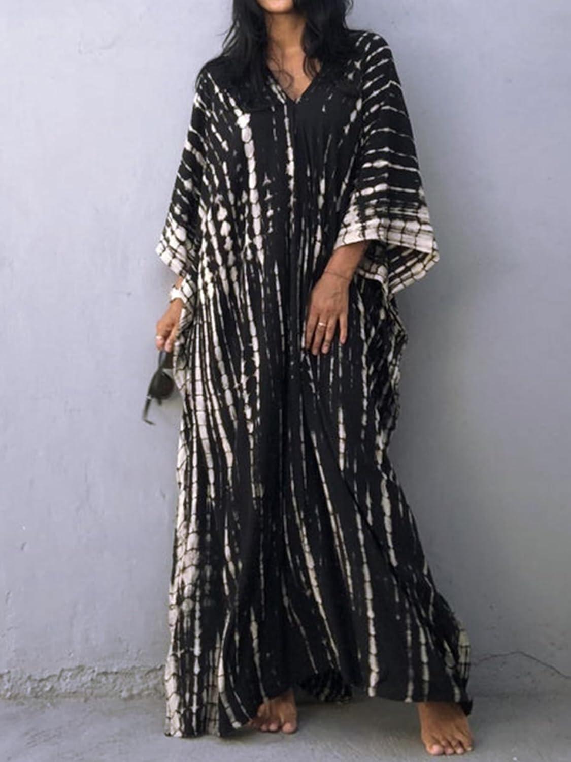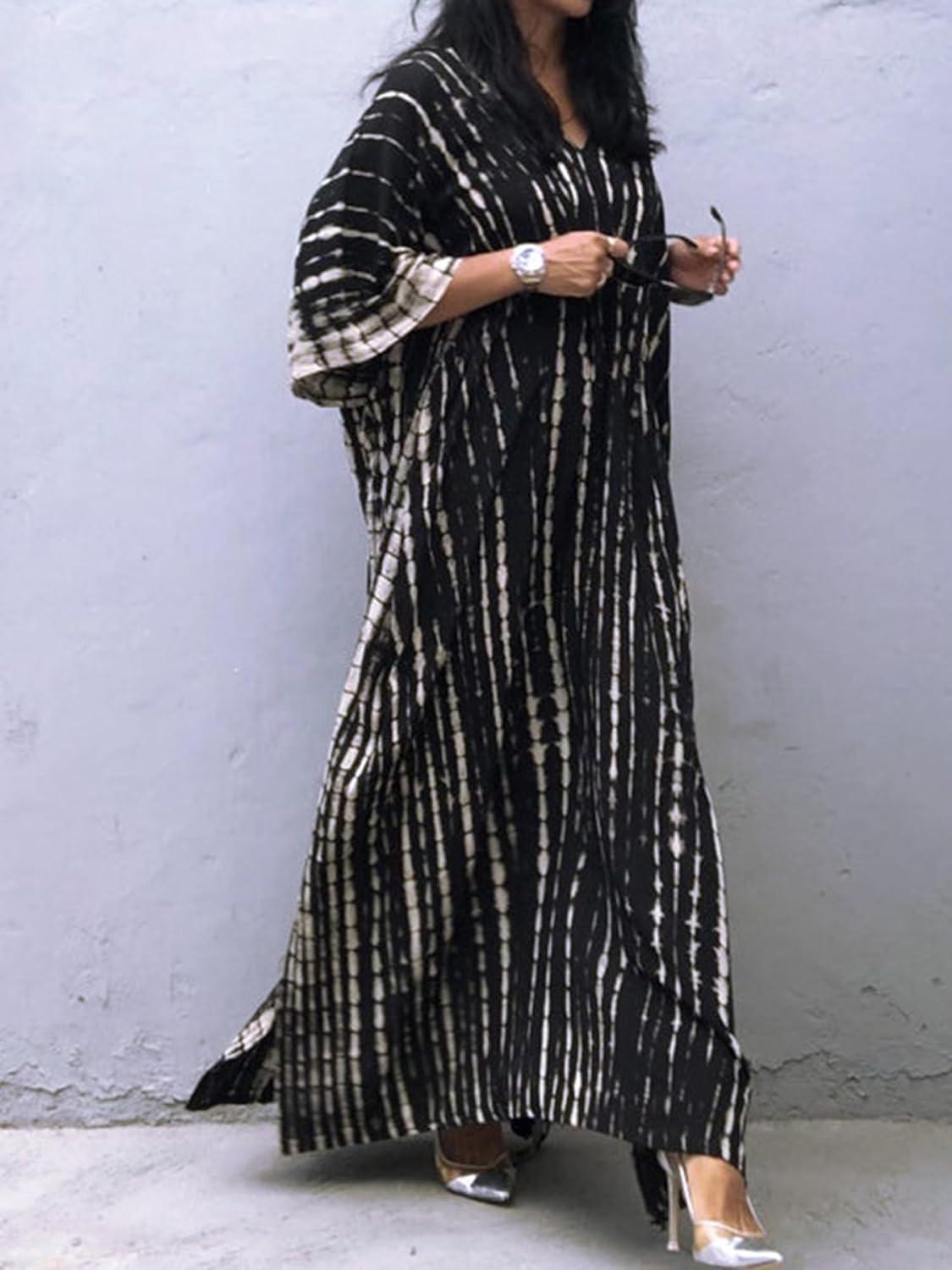 Moss Rose Women Summer Caftan Coverups Dress Kimono Beach Vacation Wear V Neck Print Maxi Boho Dress(Black)