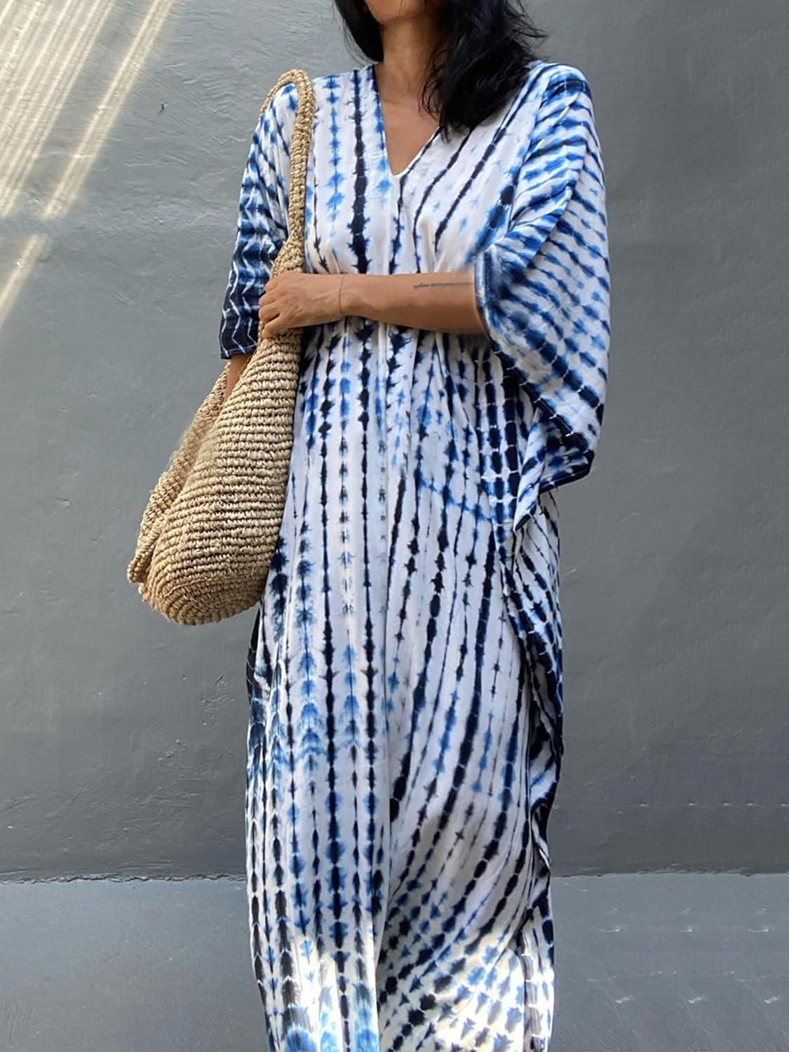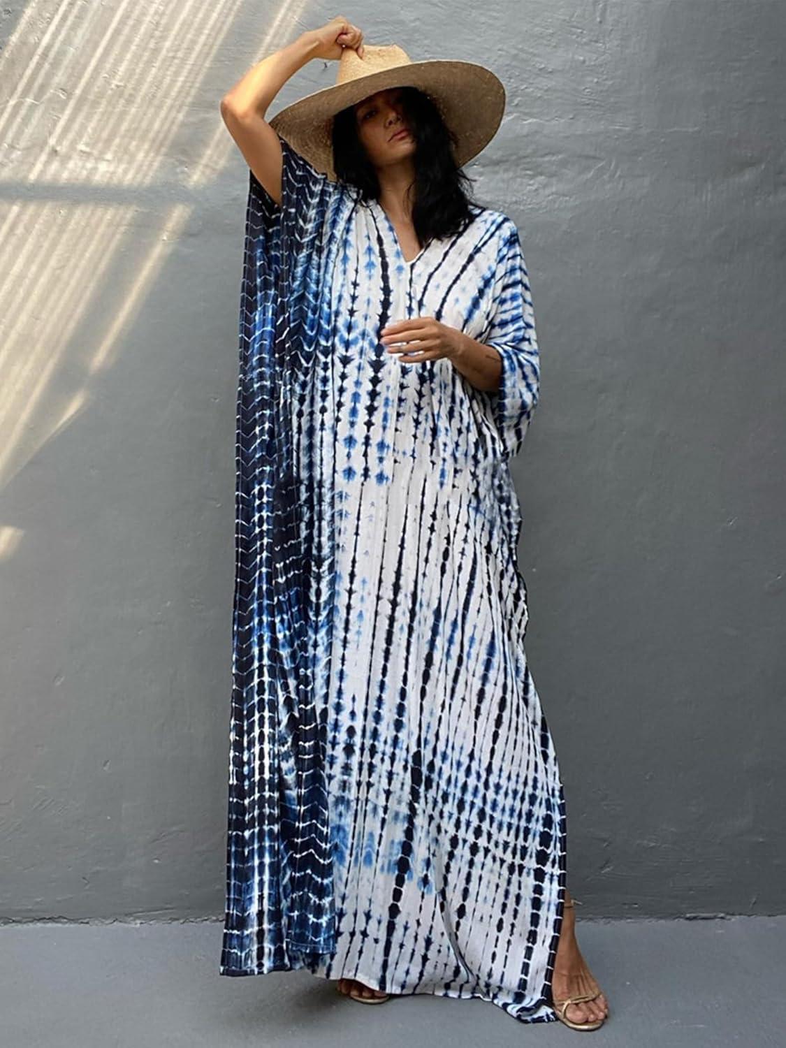 Moss Rose Women Summer Caftan Coverups Dress Kimono Beach Vacation Wear V Neck Print Maxi Boho Dress(Blue Black)
