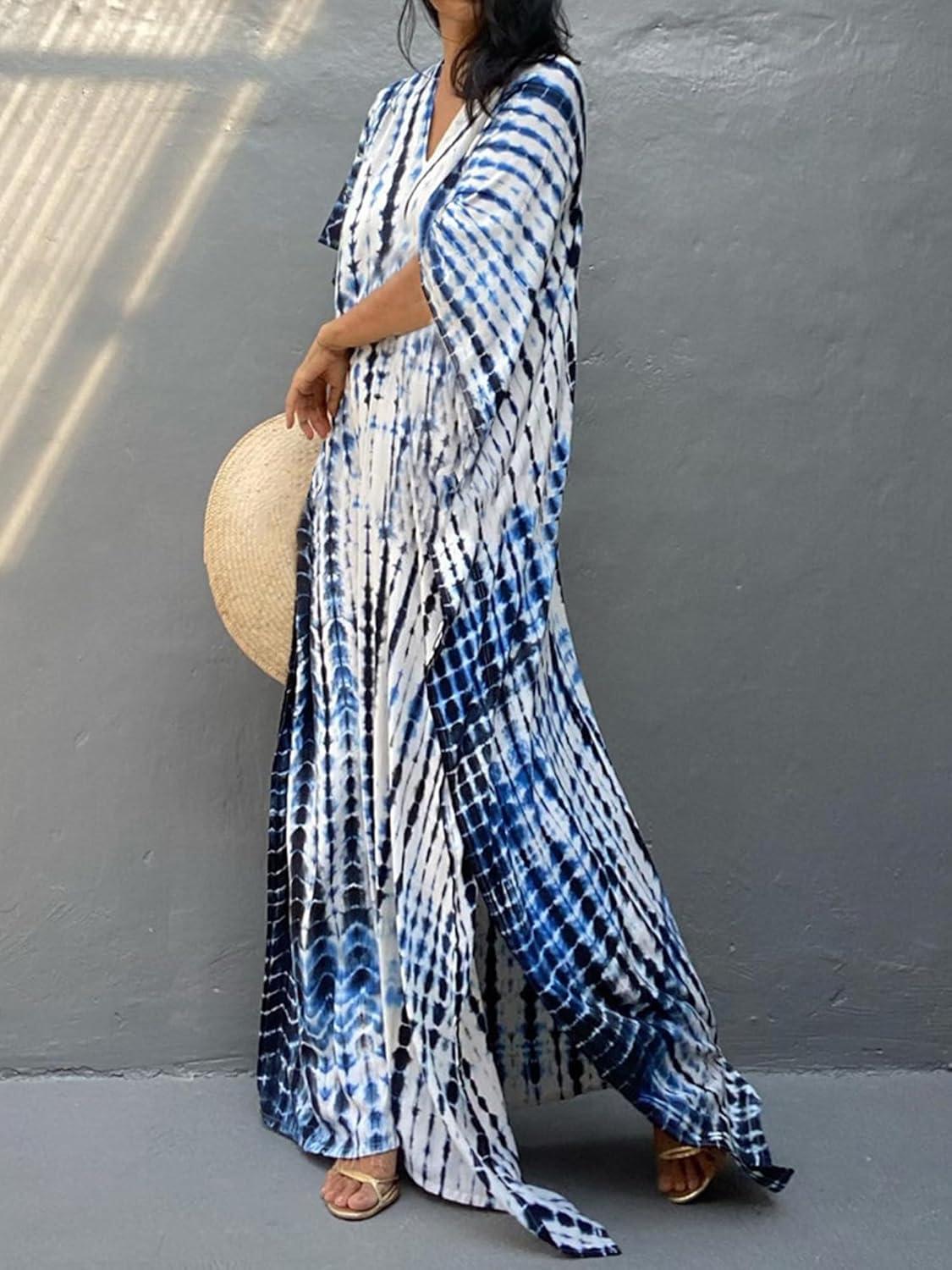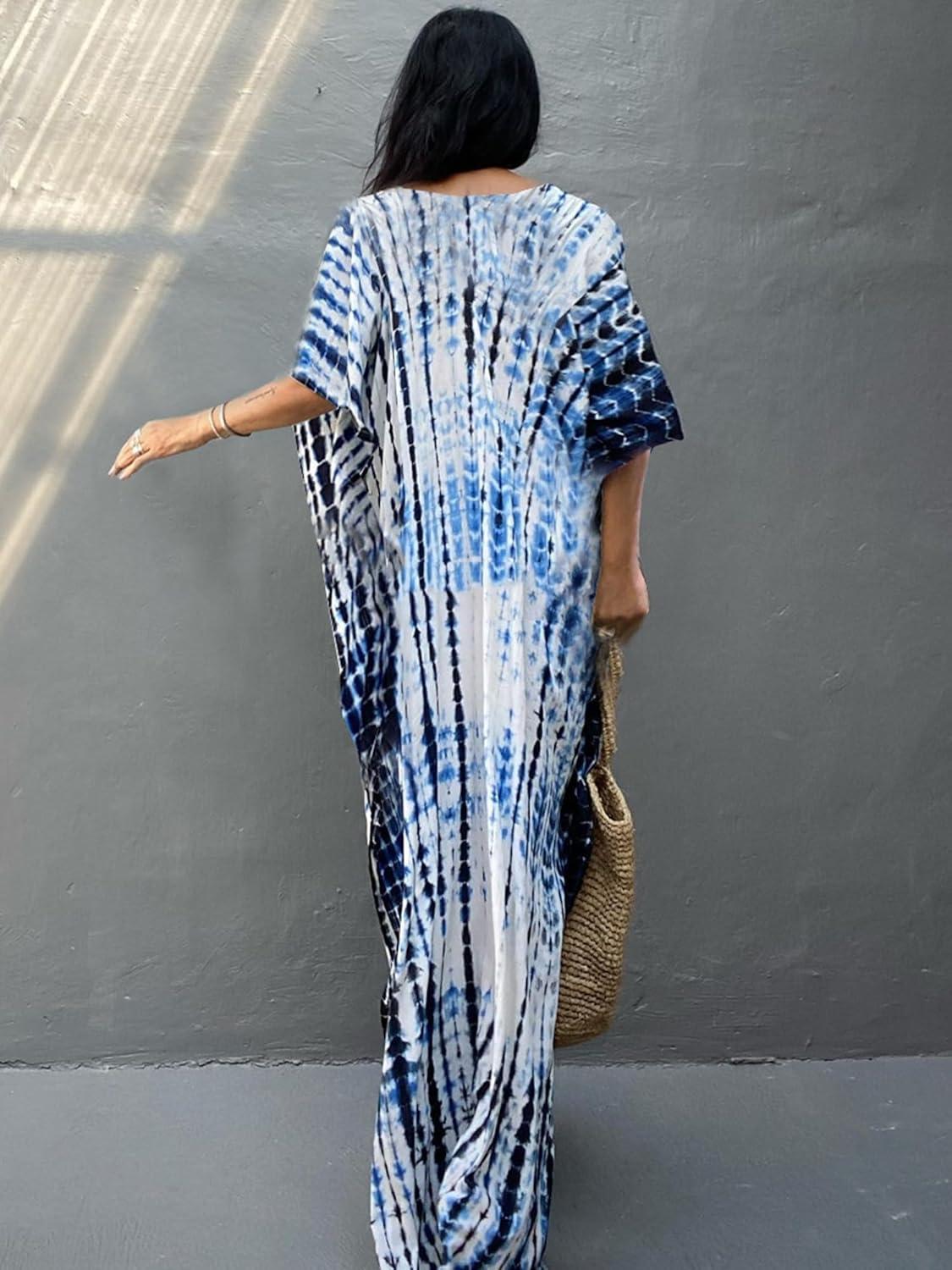 Moss Rose Women Summer Caftan Coverups Dress Kimono Beach Vacation Wear V Neck Print Maxi Boho Dress(Blue Green)