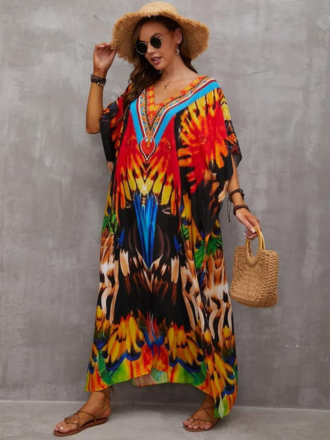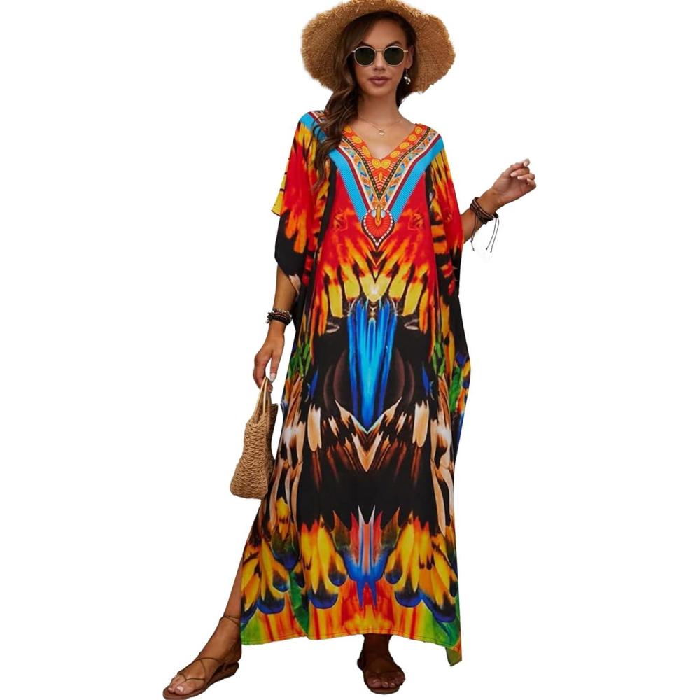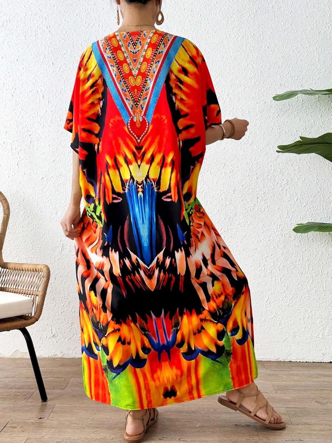 Moss Rose Women Summer Caftan Coverups Dress Kimono Beach Vacation Wear V Neck Print Maxi Boho Dress(Z Colorful 4)