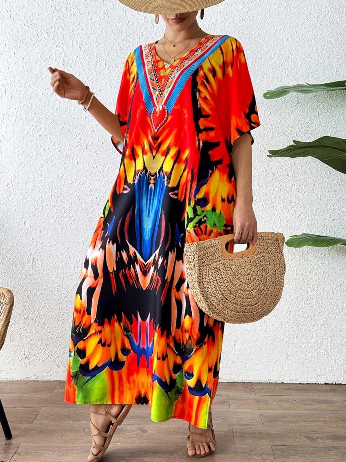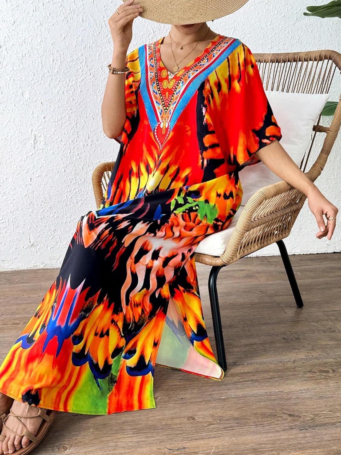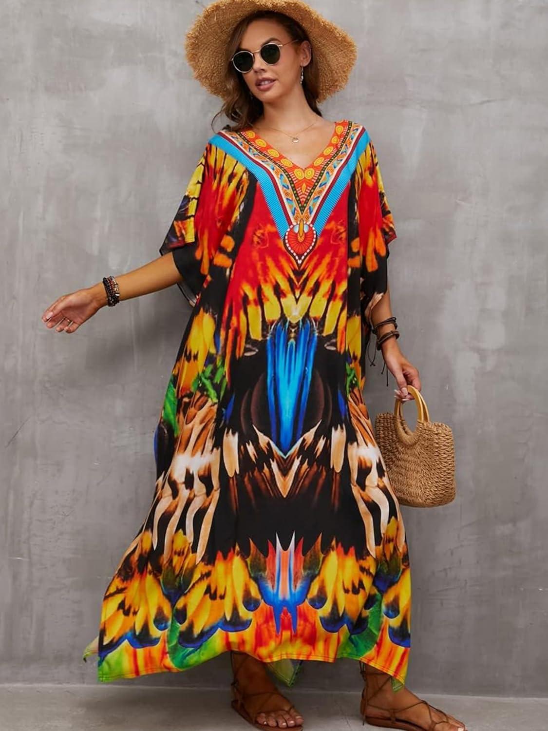 Moss Rose Women Summer Caftan Coverups Dress Kimono Beach Vacation Wear V Neck Print Maxi Boho Dress(Z Colorful 4)