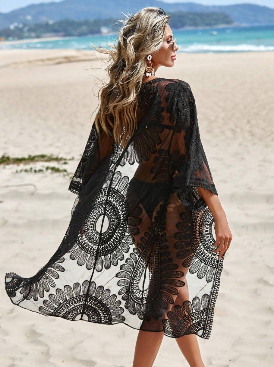 Moss Rose Womens Bathing Suit Cover Up 3/4 Sleeve Mesh Swimsuit Coverup Long Floral Beach Lace Kimono Cardigan(Black)