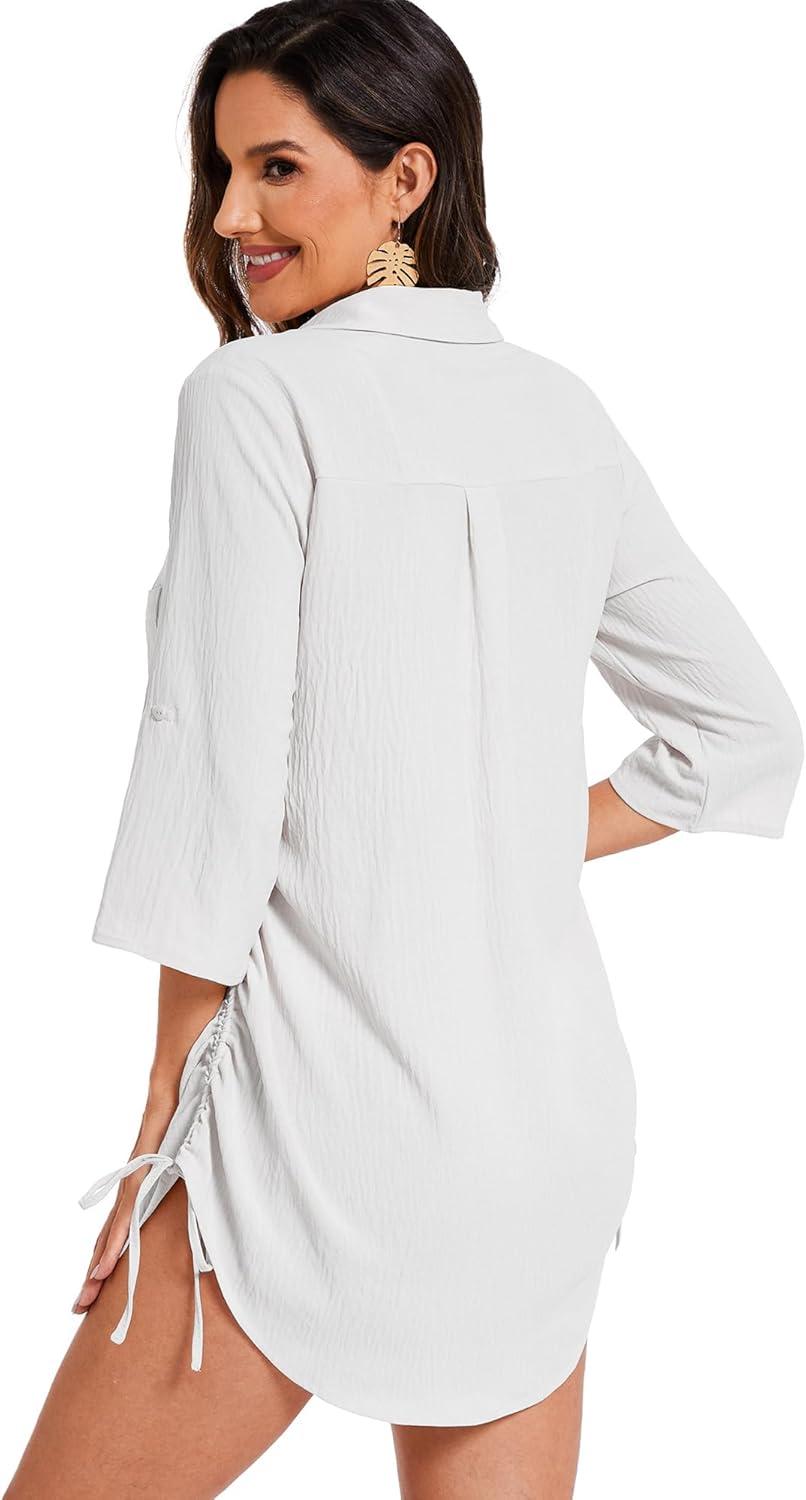 Moss Rose Womens Bathing Suit Cover Ups Bikini Swimsuit Coverup Drawstring Beach Dress Shirt(White)
