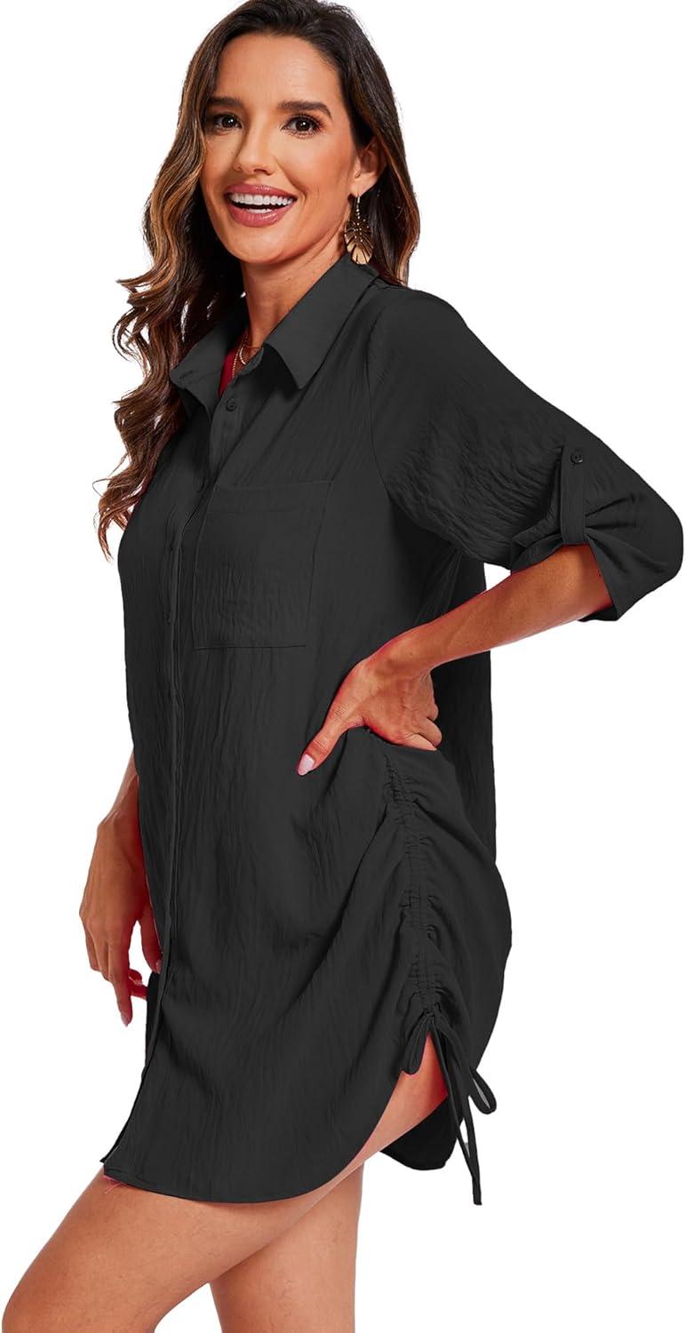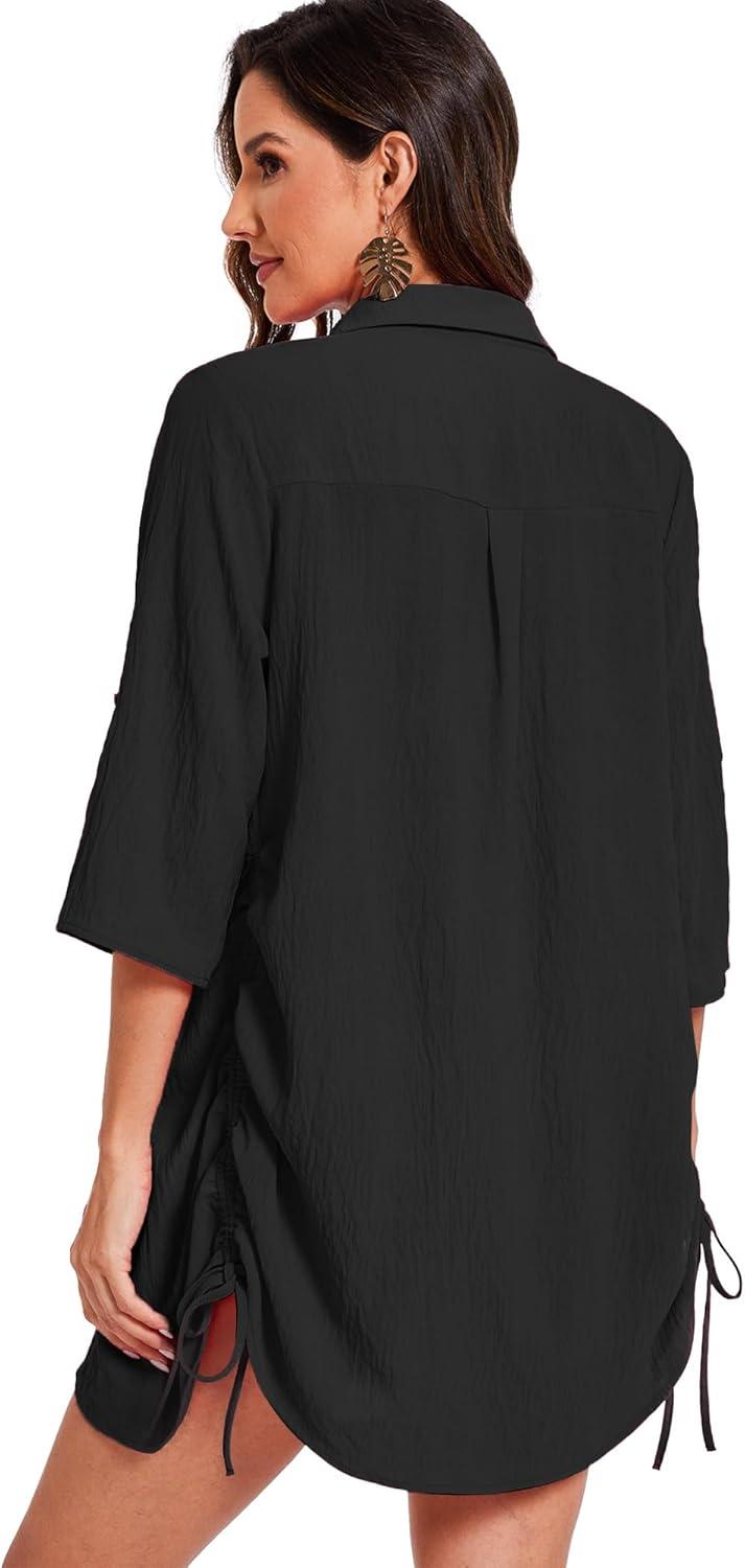 Moss Rose Womens Bathing Suit Cover Ups Bikini Swimsuit Coverup Drawstring Button Down Beach Dress Shirt(Black)