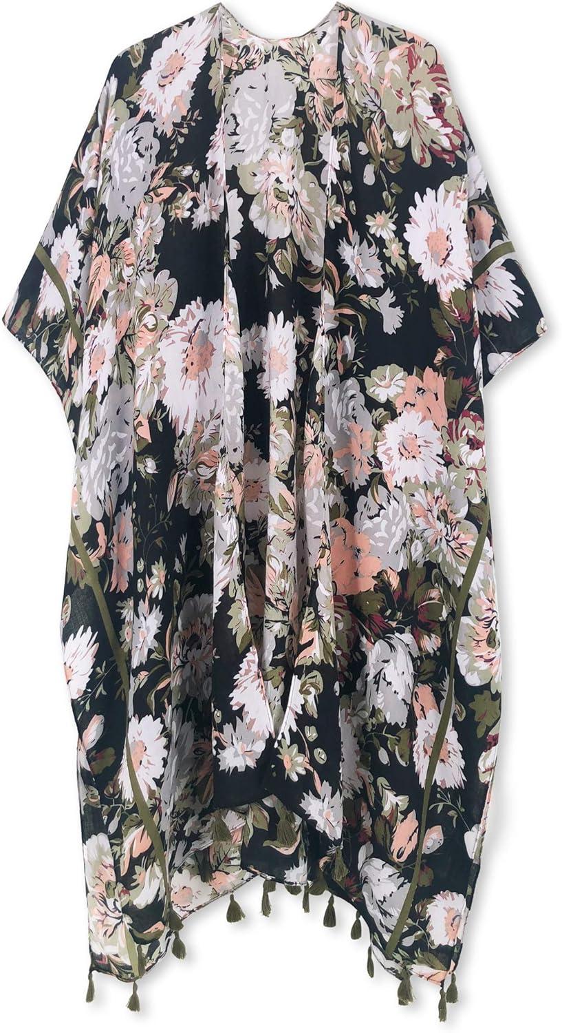 Moss Rose Women's Beach Cover up Swimsuit Kimono Cardigan with Bohemian Floral Print(Black / Army)