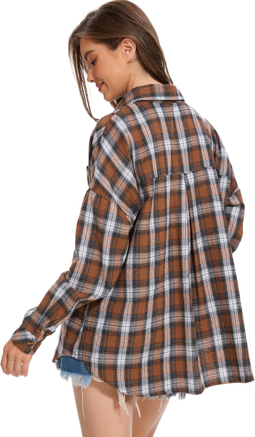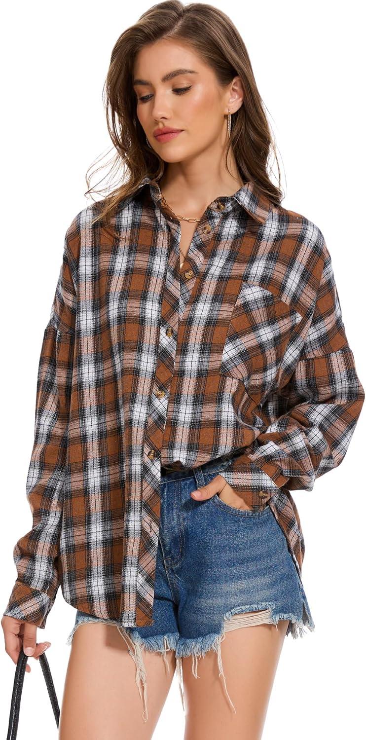 Moss Rose Womens Button Down Flannel Shirts Long Sleeve Plaid Shackets Business Casual Blouse Top(Brown Black)