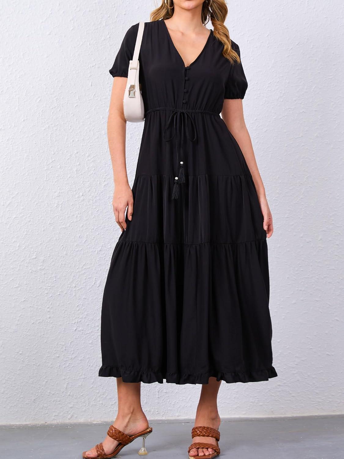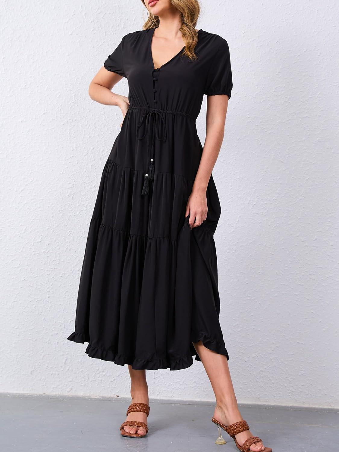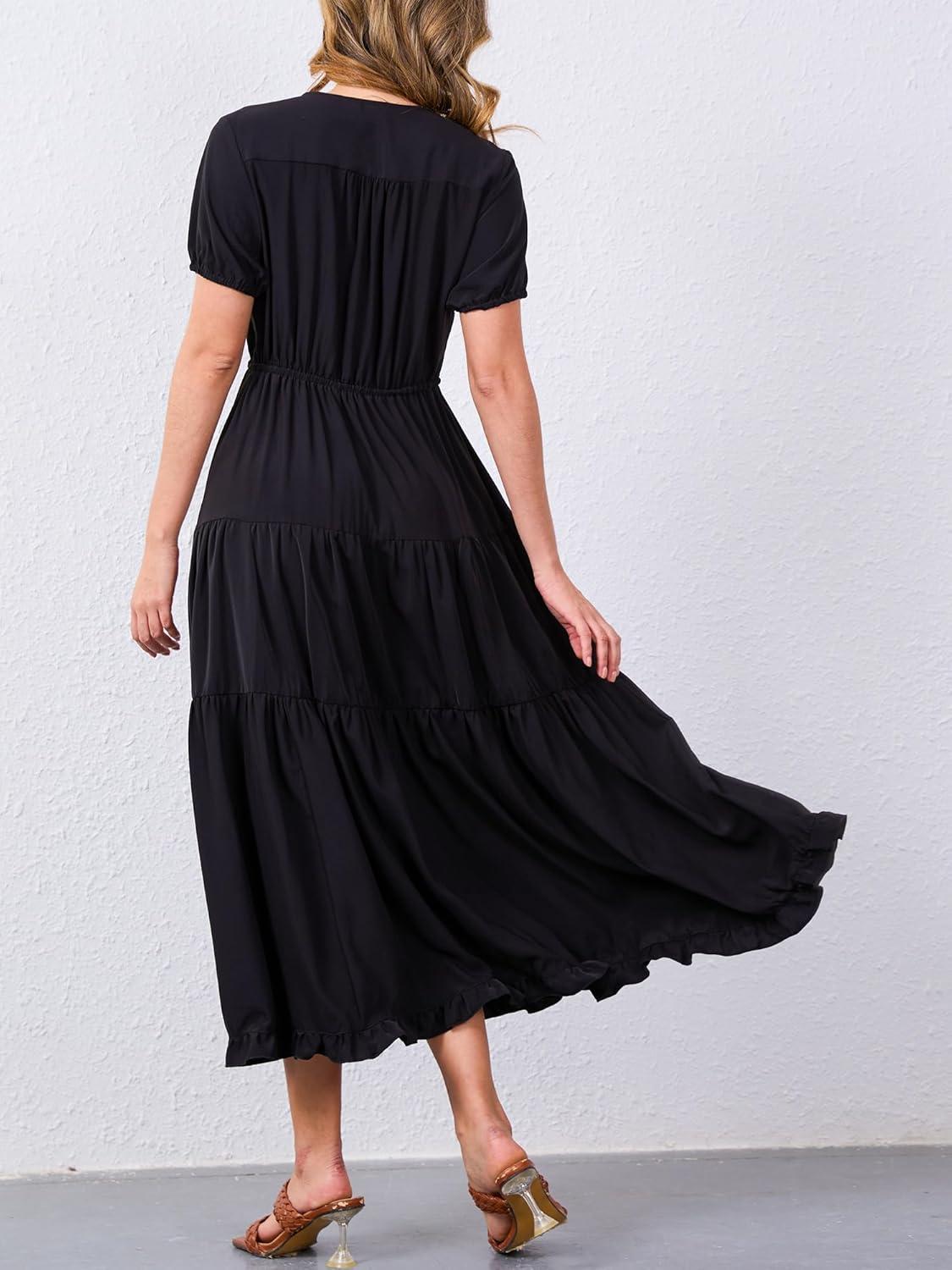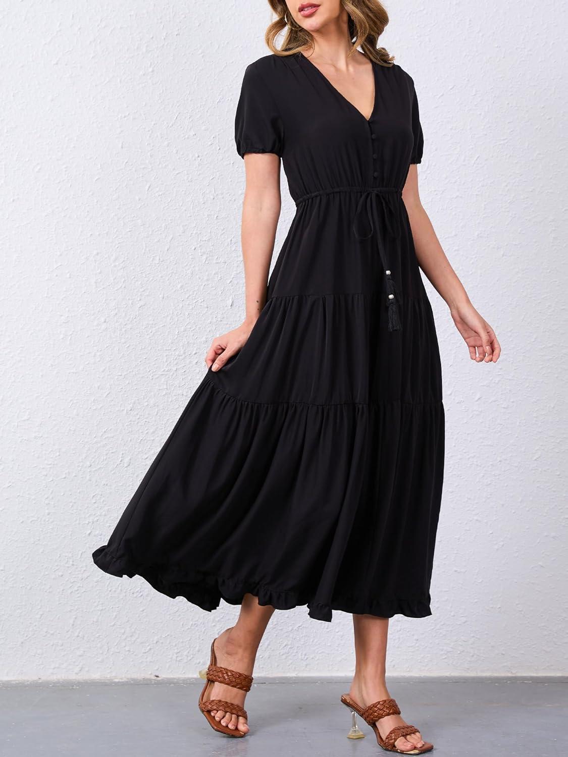 Moss Rose Women's Casual V Neck Boho Dress Puff Short Sleeve High Waist Floral Flowy Long Dresses(Black)