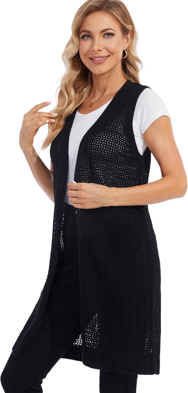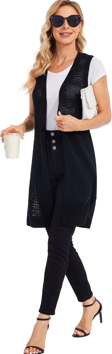 Moss Rose Womens Sleeveless Cardigans Vests Long Open Front Hollow Crochet Cardigan Sweater Duster Vest(Black)