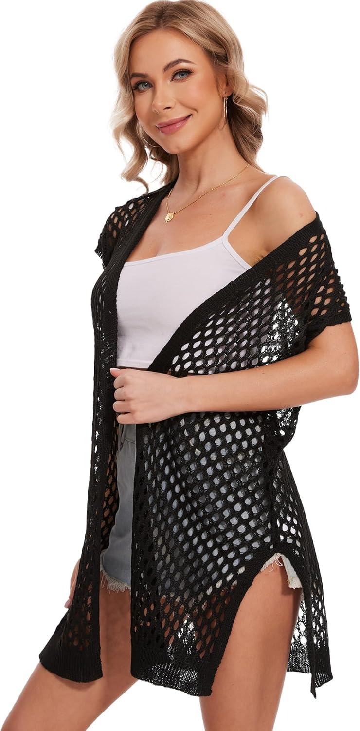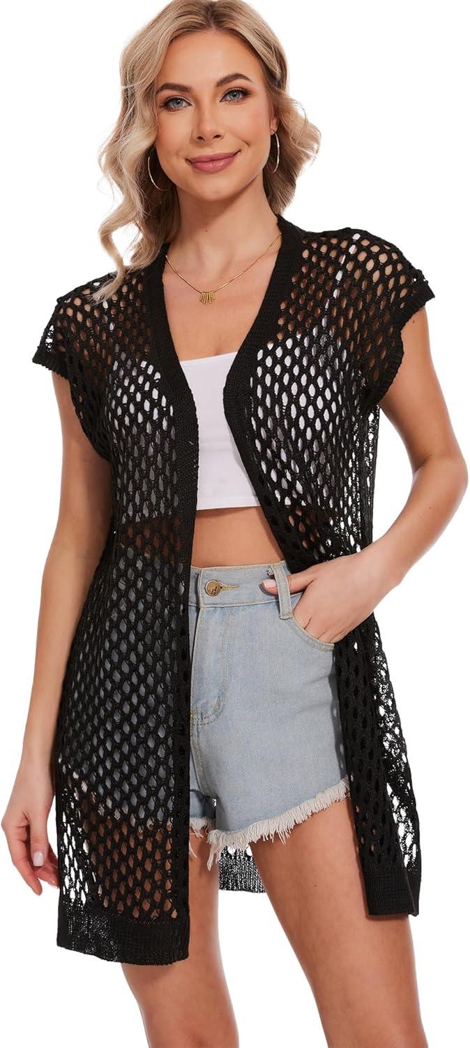 Moss Rose Womens Sleeveless Cardigans Vests Long Open Front Hollow Crochet Cardigan Sweater Duster Vest(Z Black)
