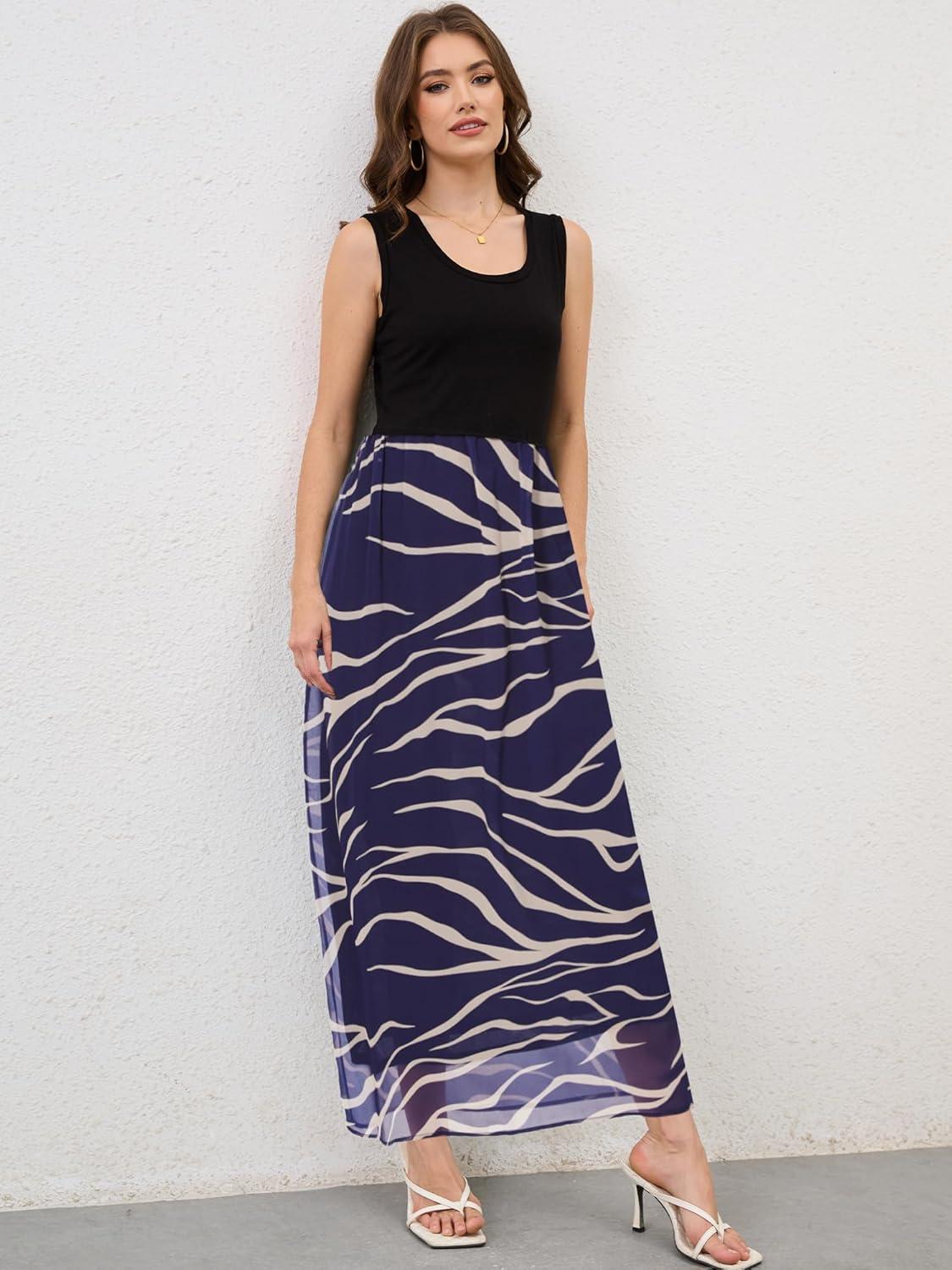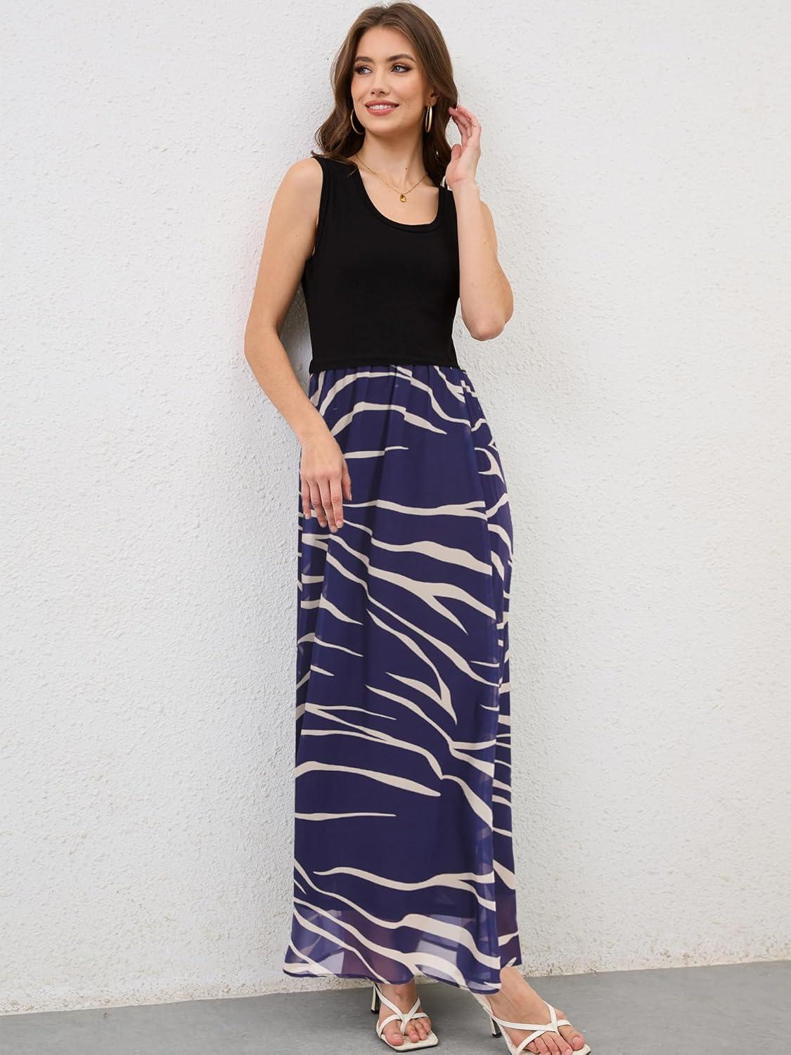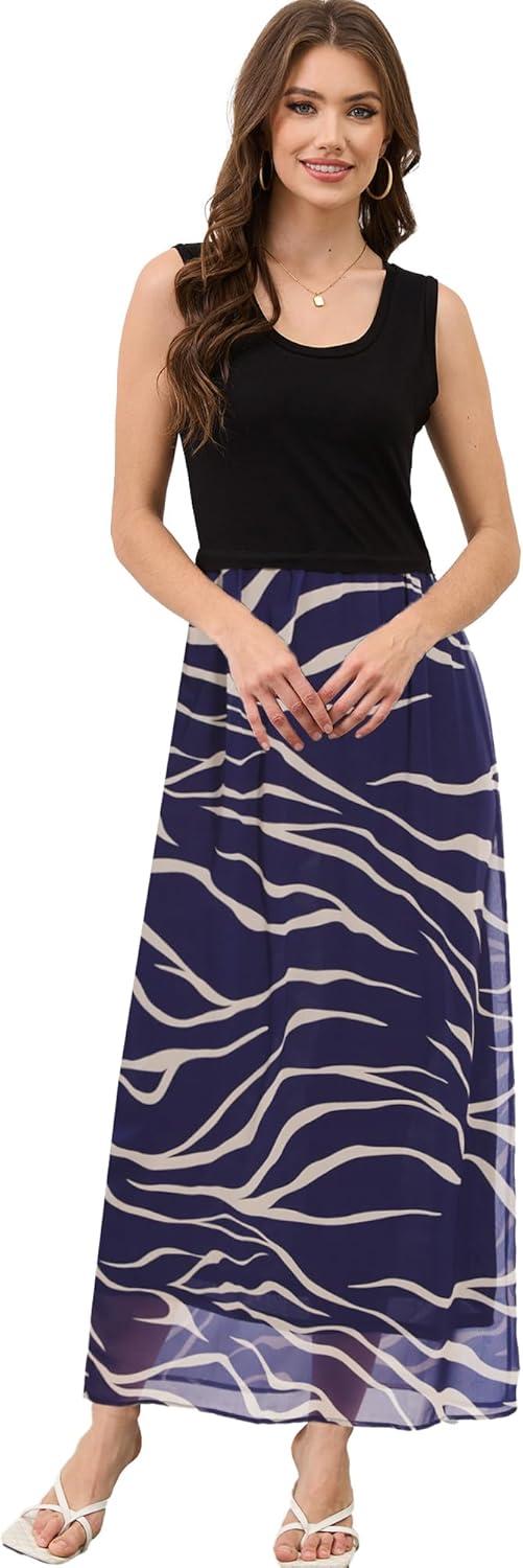 Moss Rose Women's Summer Dress Sleeveless Maxi Dresses Empire Waist Floral Print Casual Long Dress(Black+floral 4)